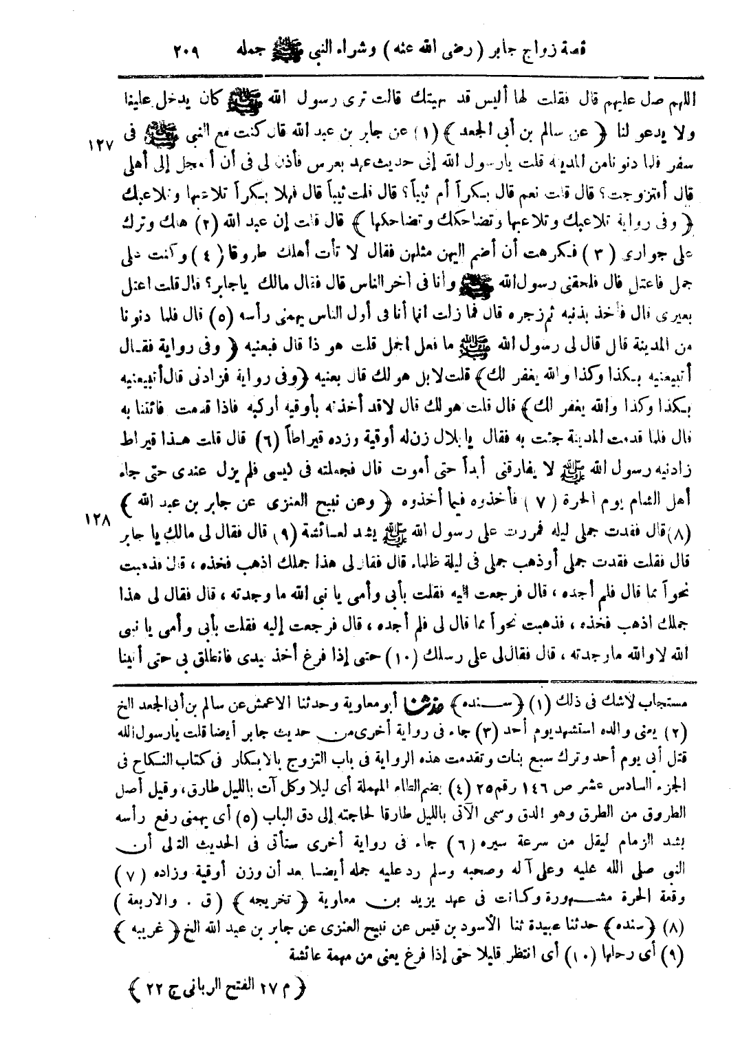 اللهم صل عليهم قال فقلت لها أليس قد بهيتك قالت ترى رسول الله صلى الله عليه وسلم كان يدخل علينا ولا يدعو لنا (عن سالم بن أبى الجعد) (1) عن جابر عبد الله قال كنت مع النبى صلى الله عليه وسلم فى سفر فلما دنونا من المدية قلت يا رسول الله إنى حديث عهد بعرس فأذن لى فى أن أعجل إلى أهلى قال أفتزوجت؟ قال قلت نعم قال بكراً أم ثيباً؟ قال قلت ثيباً قال فهلا بكراً تلاعبها وتلاعبك (وفى رواية تلاعبك وتلاعبها وتضاحكك وتضاحكها) قال قلت إن عبد الله (2) هلك وترك على حوارى (3) فكرهت أن أضم اليهن مثلهن فقال لا تأت أهلك طروقا (4) وكنت على جمل فاعتل قال فلحقنى رسول الله صلى الله عليه وسلم وأنا فى اخر الناس قال فقال مالك يا جابر؟ قال قلت اعتل بعيرى قال فأخذ بذنبه ثم زجره قال فما زلت أنما أنا فى أول الناس يهمنى رأسه (5) قال فلنا دنونا من المدينة قال قال لى رسول الله صلى الله عليه وسلم ما فعل أجمل قلت هو ذا قال فبعنيه (وفى رواية فقال أتبيعينه بكذا وكذا والله يغفر لك) قال قلت هو لك قال لا قد أخذنه باوقيه أركبه فاذا قدمت فائتنا به قال فلما قدمت المدينة جئت به فقال يا بلال زن له أوقية وزده قيراطاً (6) قال قلت هذا قيراط زادنيه رسول الله صلى الله عليه وسلم لا يفارقنى أبداً حتى أموت قال فجعلته فى كيسى فلم يزل عندى حتى جاء أهل الشام يوم الحرة (7) فأخذوه فيما أخذوه (وعن نبيح المنزى عن جابر بن عبد الله) (8) قال فقدت جملى ليله فمررت على رسول الله صلى الله عليه وسلم يشد لعائشة (9) قال فقال لى مالك يا جابر قال فقلت جملى أو ذهب جملى فى ليلة ظلماء قال فقار لى هذا جملك اذهب فخذه، قال فذهبت نحواً مما قال فلم أجده، قال فرجعت إليه فقلت بأبى وأمى يا نبى الله ما وجدته، قال فقال لى هذا جملك اذهب فخذه، فذهبت نحواُ مما قال لى فلم أجده، قال فرجعت إليه فقلت بأبى وأمى يا نبى الله لا والله ما وجدته، قال فقال لى على رسلك (10) حتى إذا فرغ أخذ بيدى فانطلق بي حتى أتينا