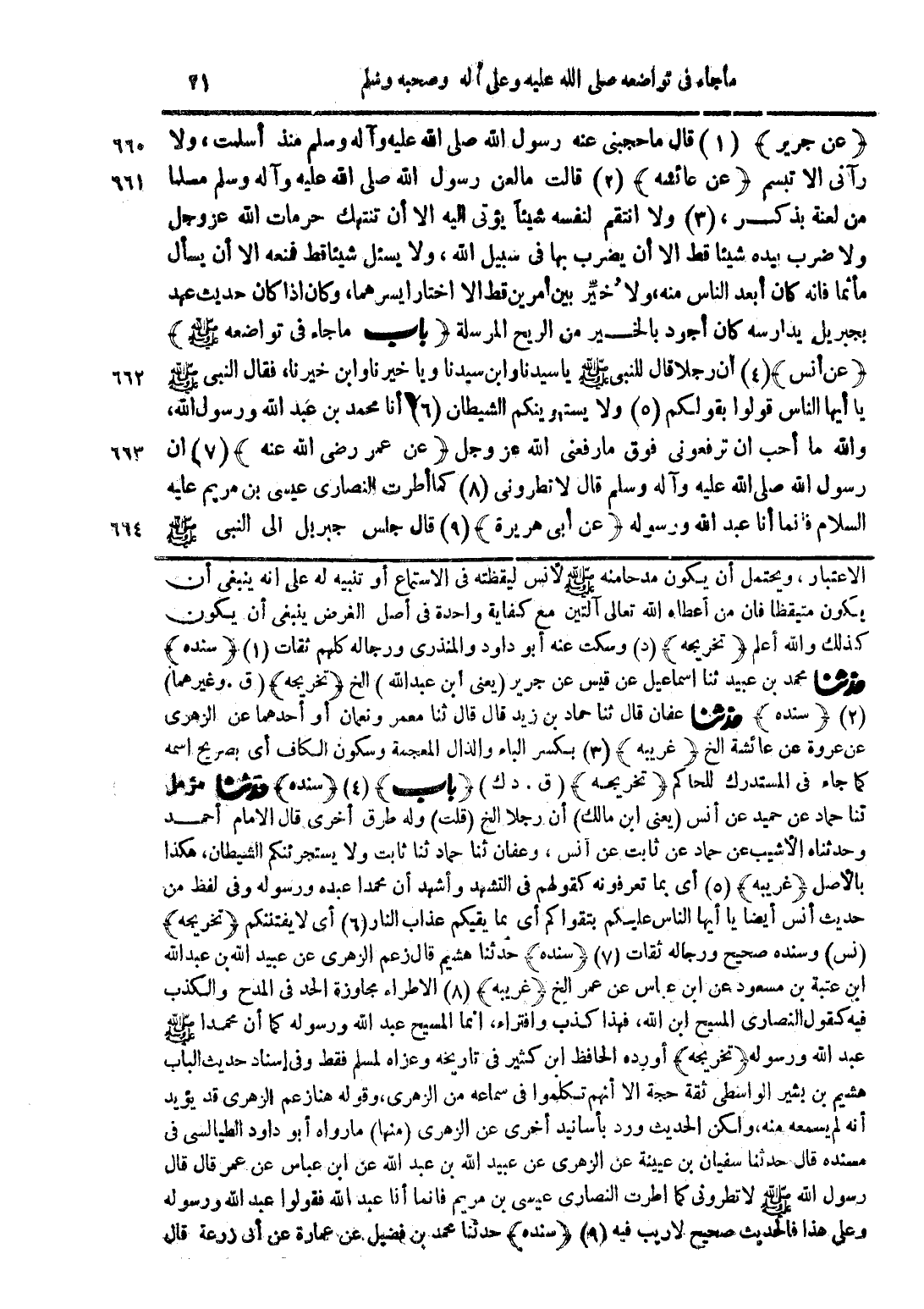 (عن جرير) قال ما حجبني عنه رسول الله صلى الله عليه وآله وسلم منذ أسلمت، ولا رآني ألا تبسم (عن عائشة) قال مالعن رسول الله صلى الله عليه وآله وسلم مسلما من لعنة بذكر، ولا انتقم لنفسه شيئًا يؤتي إليه إلا أن تنتهك حرمات الله عز وجل ولا ضرب بيده شيئًا قط إلا أن يضرب بها في سبيل الله، ولا يسئل شيئًا قط قمنعه إلا أن يسأل مأثما فإنه كان أبعد الناس منه، ولا خيِّر بين أمرين قط إلا اختار أيسرهما، وكان إذا كان حديث عهد بجبريل يدارسه كان أجود بالخير من الريح المرسلة (باب ما جاء في تواضعه صلى الله عليه وسلم) (عن أنس) أن رجلا قال للنبي صلى الله عليه وسلم ياسيدنا وابن سيدنا ويا خيرنا وابن خيرنا، فقال النبي صلى الله عليه وسلم يا أيها الناس قولوا بوقلكم ولا يستهوينكم الشيطان أنا محمد بن عبد الله ورسول الله، والله ما أحب أن ترفعوني فوق ما رفعني الله عز وجل (عن عمر رضي الله عنه) أن رسول الله صلى الله عليه وآله وسلم قال لا نطروني كما أطرت النصارى عيسى بن مريم عليه السلام فإنما أنا عبد الله ورسوله (عن أبي هريرة) قال جلس جبريل إلى النبي صلى الله عليه وسلم