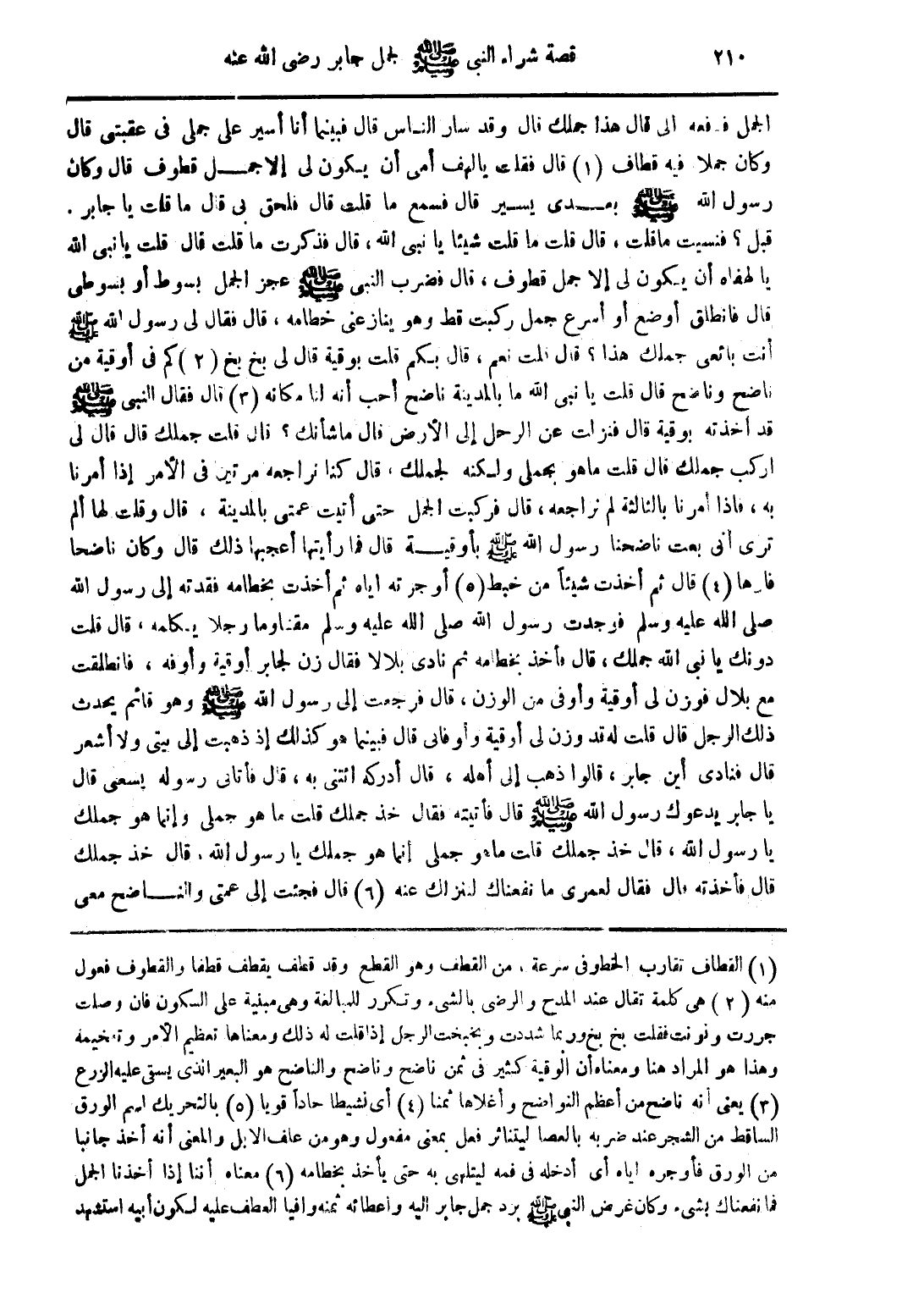 (1) القطاف تقارب الخطو فى سرعة، من القطف وهو القطع وقد قطف يقطف قطفا والقطوف فعول منه (2) هى كلمة تقال عند المدح والرضى بالشئ وتكرر للمبالغة وهى مبنية على السكون فان وصلت جررت ونونت فقلت بخ بخ وربما شددت وبخبخت الرجل إذا قلت له ذلك ومعناها تعظيم الأمر وتضخيمه وهذا هو المراد هنا ومعناه أن الوقية كثير فى ثمن ناضج وناضح والناضح هو البعير الذى يسقى عليه الزرع (3) يعنى أنه ناضح من أعظم النواضح وأغلاها ثمنا (4) أى نشيطا حاداً قويا (5) بالتحريك اسم الورق الساقط من الشجر عند ضربه بالعصا ليتناثر فعل بمعنى مفعول وهو من علف الابل والمعنى أنه أخذ جانبا من الورق فأوطره اياه أى ادخله فى فمه ليتلهى به حتى يأخذ بخطامه (6) معناه أننا إذا أخذنا الجمل فما نفعناك بشئ وكان غرض النبى صلى الله عليه وسلم برد جمل جابر إليه واعطائه ثمنه وافيا العطف عليه لكون أبيه استشهد