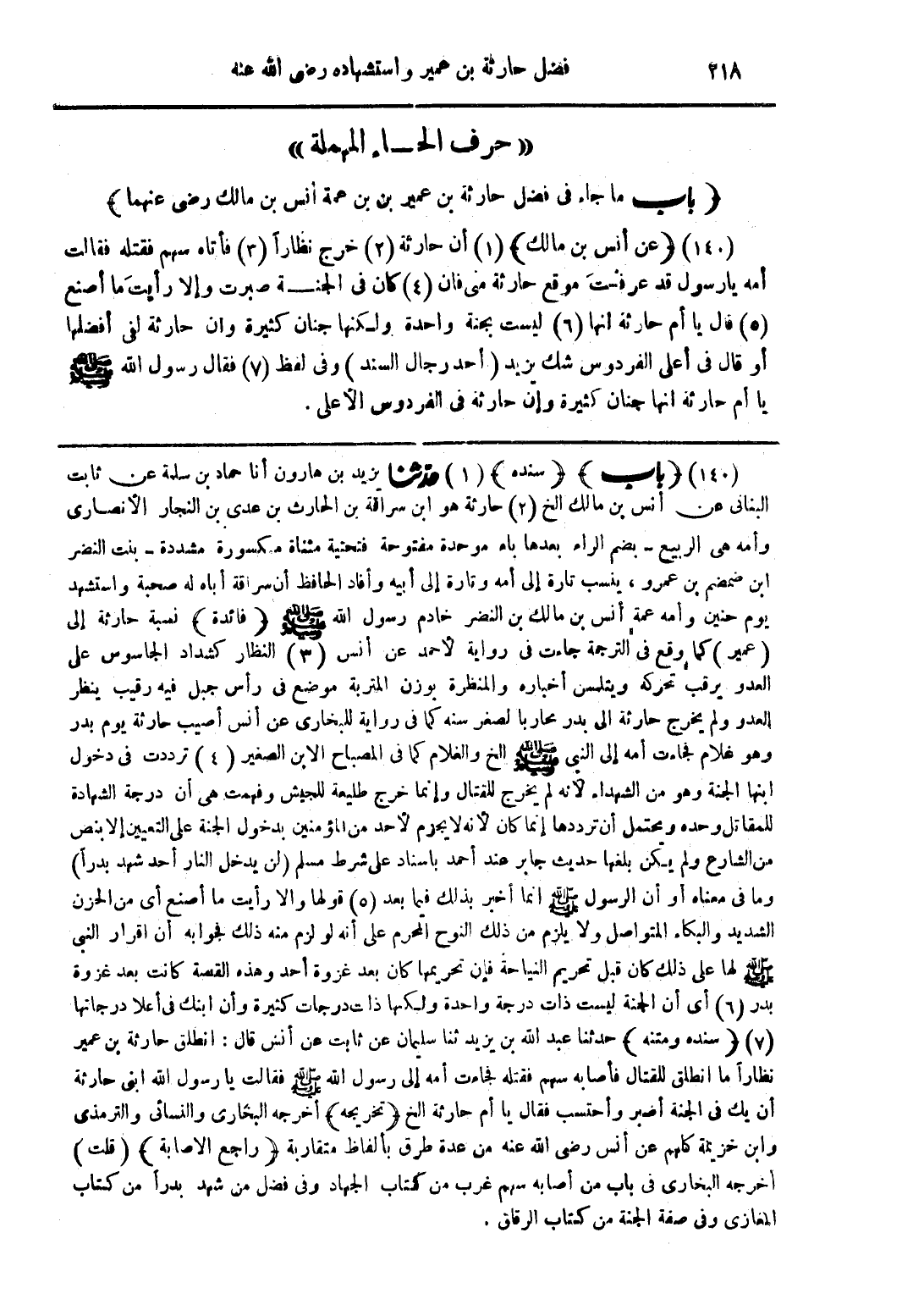 (عن أنس بن مالك) (1) أن حارثة (2) خرج نظارًا (3) فأتاه سهم فقتله فقالت أمه يا رسول قد عرفت موقع حارثة منى فان (4) كان فى الجنة صبرت وإلا رأيت ما أصنع (5) قال يا لأم حارثة أنها (6) ليست بجنة واحدة ولكنها جنان كثيرة وان حارثة لفى أفضلها أو قال في أعلى الفردوس شك يزيد (أحد رجال السند) وفى لفظ (7) فقال رسول الله صلى الله عليه وسلم يا أم حارثة انها جنان كثيرة وإن حارثة في الفردوس الأعلى.