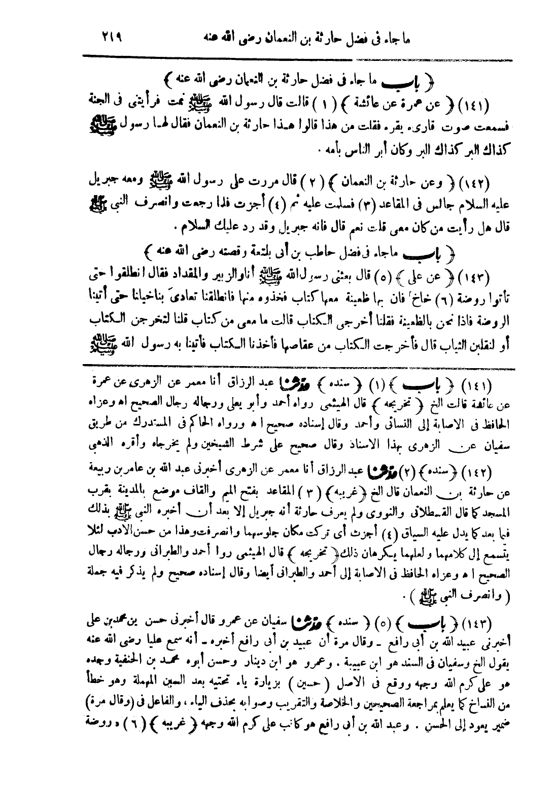 (142) (وعن حارثة بن النعمان) (2) قال مررت على رسول الله صلى الله عليه وسلم ومعه جبريل عليه السلام جالس فى المقاعد (3) فسلمت عليه ثم (4) أجزت فلما رجعت وانصرف النبى صلى الله عليه وسلم قال هل رأيت من كان معى قلت نعم قال فانه جبريل وقد رد عليك السلام.