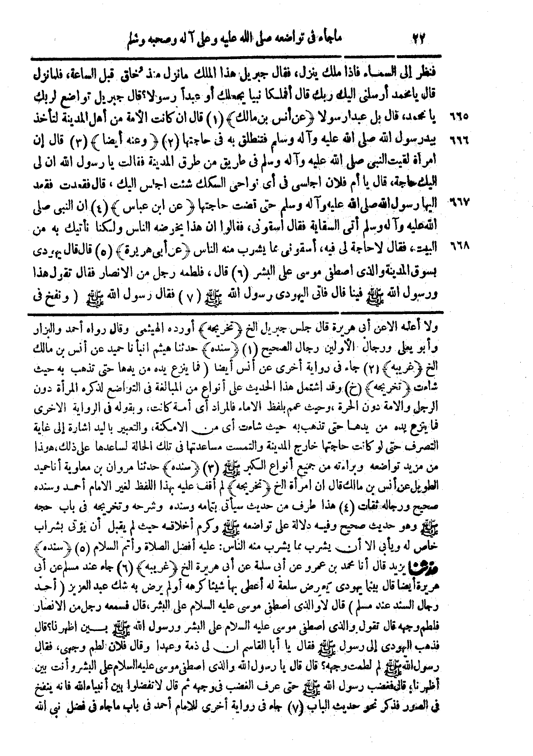 فنظر إلى السماء فإذا ملك ينزل، فقال جبريل هذا الملك ما نزل منذ خلق قبل الساعة، فلما نزل قال يا محمد أرسلني إليك ربك قال أفملكا نبيا يجعلك أو عبدًا رسولا؟ قال جبريل تواضع لربك يا محمد، قال بل عبدا رسولا (عن أنس بن مالك) قال أن كانت الأمة من أهل المدينة لتأخذ بيد رسول الله صلى الله عليه وآله وسلم فتنطلق به في حاجتها (وعنه أيضا) قال إن أمرأة لقيت النبي صلى الله عليه وآله وسلم في طريق من طرق المدينة فقالت يا رسول الله أن لي إليك حاجة، قال يا أم فلان اجلسي في أي نواحي السكك شئت اجلس إليك، قال فقعدت فقعد إليها رسول الله صلى الله عليه وآله وسلم حتى قضت حاجتها (عن ابن عباس) أن النبي صلى الله عليه وآله وسلم أتي السقاية فقال أسقوني، فقالوا أن هذا يخوضه الناس ولكنا نأتيك به من البيت، فقال لا حاجة لي فيه، أسقوني مما يشرب منه الناس (عن أبي هريرة) قال قال يهودي بسوق المدينة والذي اصطفى موسى على البشر قال، فلطمه رجل من الانصار فقال تقول هذا ورسول الله صلى الله عليه وسلم فينا قال فاتي اليهودي رسول الله صلى الله عليه وسلم فقال رسول الله صلى الله عليه وسلم (ونفخ في