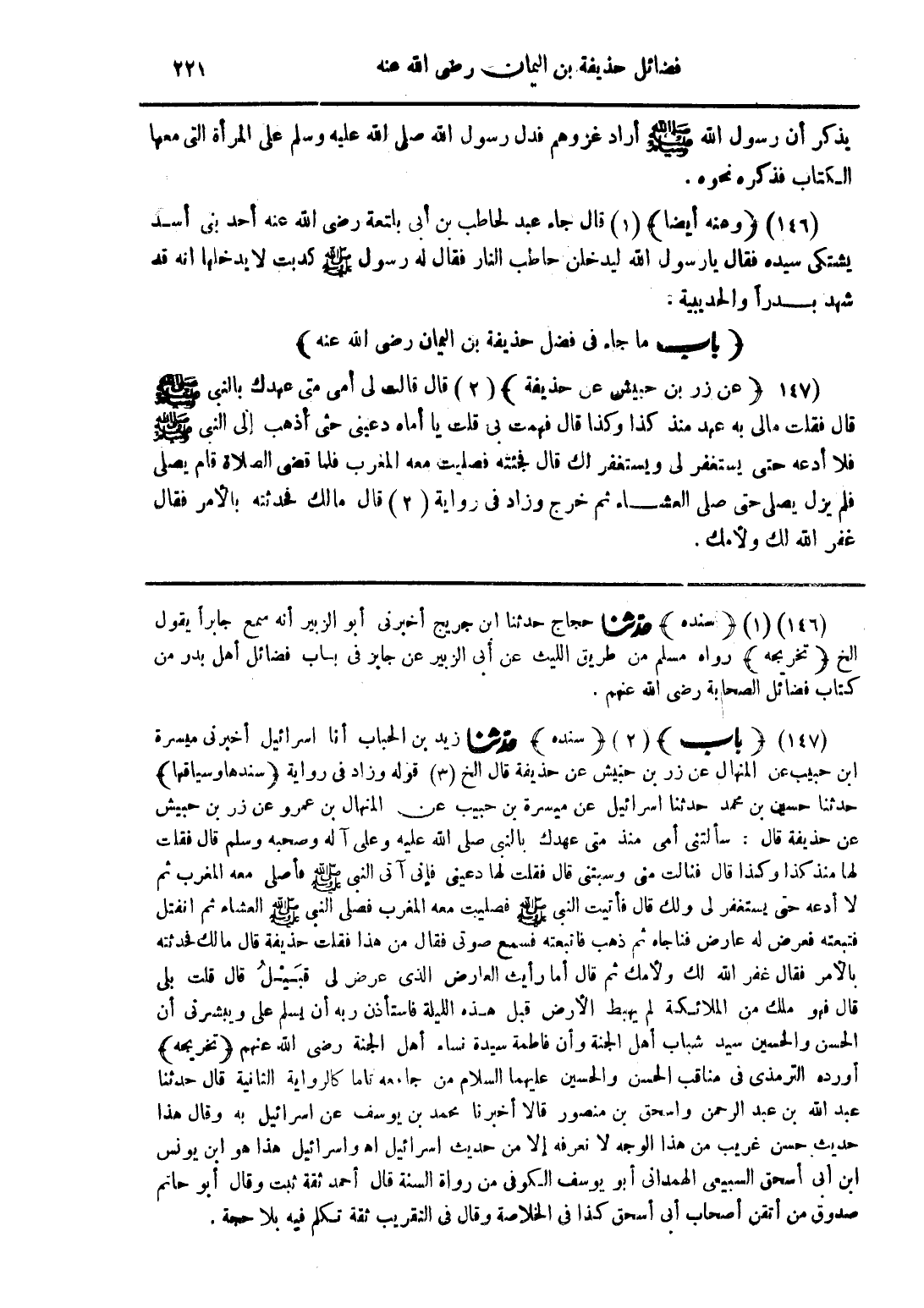 (147) (باب) (2) (سنده) حدّثنا زيد بن الحباب أنا اسرائيل أخبرنى ميسرة ابن حبيب المنهال عن زر بن حبيش عن حذيفة قال الخ (3) قوله وزاد فى رواية (سندها وسياقها) حدثنا حسين بن محمد حدثنا اسرائيل عن ميسرة بن حبيب عن المنهال بن عمرو عن زر بن حبيش ع 7 ن حذيفة قال: سألتنى أمى منذ متى عهدك بالنبى صلى الله عليه وعلى آله وصحبه وسلم قال فقلت لها منذ كذا وكذا قال فنالت منى وسبتنى قال فقلت لها دعينى فإنى آتى النبى صلى الله عليه وسلم فأصلى معه المغرب ثم لا أدعه حتى يستغفر لى ولك قال فأتيت النبى صلى الله عليه وسلم فصليت معه المغرب فصلى النبى صلى الله عليه وسلم العشاء ثم انفتل فتبعته فعرض له عارض فناجاه ثم ذهب فاتبعته فسمع صوتى فقال من هذا فقلت حذيفة قال مالك فحدثته بالأمر فقال غفر الله لك ولأمك ثم قال أما رأيت العارض الذى عرض لى قبيل قال قلت بلى قال فهو ملك من الملائكة لم يهبط الأرض قبل هذه الليلة فاستأذن ربه أن يسلم على ويبشرنى أن الحين والحسين سيد شباب أهل الجنة وأن فاطمة سيدة نساء أهل الجنة رضى الله عنهم (تخريجه) أورده الترمذى فى مناقب الحسن والحسين عليهما السلام من جامعه تاما كالرواية الثانية قال حدثنا عبد الله بن عبد الرحمن واسحق بن منصور قالا أخبرنا محمد بن يوسف عن اسرائيل به وقال هذا حديث حسن غريب من هذا الوجه لا نعرفه إلا من حديث اسرائيل أهـ واسرائيل هذا هو ابن يونس ابن ابى أسحق السبيعى الهمدانى أبو يوسف الكوفى من رواة السنة قال أحمد ثقة ثبت وقال أبو حاتم صدوق من أتقن أصحاب أبى أسحق كذا فى الخلاصة وقال فى التقريب ثقة تكلم فيه بلا حجة.