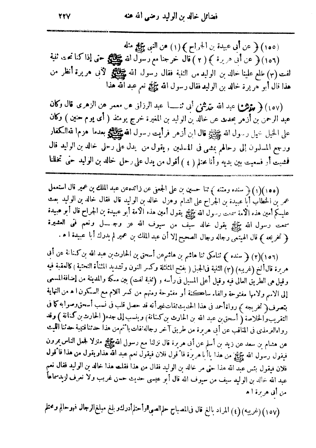 (156) (2) (سنده) ثنا مكى ثنا هاشم بن هاشم عن أسحق بن الحارث بن عبد الله بن كنانة عن أبى هريرة قال ألخ (غريبه) (3) الثنية فى الجبل (بفتح المثلثلة وكسر النون وتشديد المثنأة التحتية) كالعقبة فيه وقيل هى الطريق العالى فيه وقيل أعلى المسيل فى رأسه و (ثنية لفت) بين مكة والمدينة من إضافة المسمى إلى الاسم ولامها مفتوحة والفاء ساكنة أو مفتوحة ومنهم من كسر اللام مع السكون أهـ من النهاية بتصرف (تخريجه) رواة أحمد فى هذا الحديث ثقات غير أنه قد حصل قلب فى نسب أسحق وصوابه كما فى التقريب والخلاصة (أسحق بن عبد الله بن الحارث بن كمامة) وينسب إلى جده (الحارث بن كنانة) وقد رواه الترمذى فى المناقب عن أبى هريرة من طريق آخر رجاله ثقات بأتم من هذا حدثنا قتيبة حدثنا الليث عن هشام بن سعد عن زيد بن أسلم عن أبى هريرة قال نزلنا مع رسول الله صلى الله عليه وسلم منزلا فجعل الناس يمرون فيقول رسول الله صلى الله عليه وسلم من هذا يا أبا هريرة فأقول فلان فيقول نعم عبد الله هذا ويقول من هذا فأقول فلان فيقول بئس عبد الله هذا حتى مر خالد بن الوليد فقال من هذا فقلت هذا خالد بن الوليد فقال نعم عبد الله خالد بن الوليد سيف من سيوف الله قال أبو عيسى حديث حسن غريب ولا نعرف لزيد سماعاً من أبى هريرة أهـ.