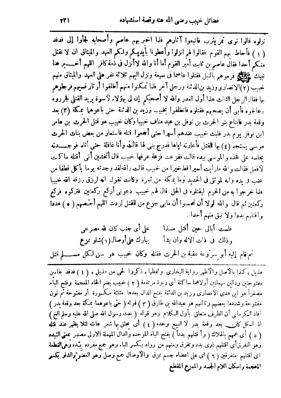 هذيل، كذا بالأصل والأظهر رواية البخارى ولفظها "ذكروا الحى من هذيل" (1) فدفد بفائين مفتوحتين ودالين مهملتين أولاهما ساكنة أى ربوة مرتفعة (2) خبيب بضم الخاء المعجمة وفتح الباء مصغراً هو ابن عدى الانصارى وزيد بن الدثنة بفتح الدال بعدها مثلثة مكسورة أو مفتوحة ثم نون مفتوحة وشددها بعضهم وثالثهم هو عبد الله بن طارق (3) قوله (حتى باعوهما بمكة بعد وقعة بدر) أفاد الكرمانى أن الظرف متعلق بأول الكلام وهو قوله (بعث رسول الله صلى الله عليه وسلم صلى الله عليه وسلم الخ) إذ الكل كان بعد وقعة بدر لا البيع وحده (4) أى يحلق بها شعر عانته لئلا يظهر عند قتله (5) أى عمهم بالهلاك (وأقتلهم بدداً) بفتح الباء الموحدة والدال المهملة الاولى مصدر بمعنى التبدد وهوالتفرق أى اقتلهم ذوى بدد وتفرق ومنهم من رواه بكسر الباء وهو جمع مفرده بدّه وهى القطعة اى اقتلهم متفرقين (6) اى على اعضاء جسم ممزق والأوصال جمع وصل وهو العضو والشار بكسر المعجمة وإسكان اللام الجسد والممزع المقطع