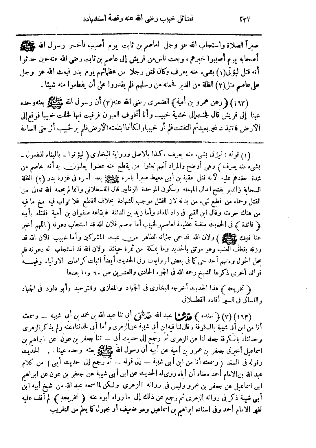 1) قوله: ليؤتى بشئ منه يعرف، كذا بالاصل ورواية البخارى (ليؤتوا -بالبناء للمفعول- بشئ منه يعرف) وهى أوضح والمراد أنهم بعثوا من يقطع منه عضوا يعلمون به انه عاصم من شدة حقدهم عليه لأنه قتل عقبة بن لأبى معيط صبراً بأمره صلى الله عليه وسلم بعد أن أسره فى عزوة بدر (2) الظلة السحابة والدبر بفتح الدال المهمله وسكون الموحدة الزنابير قال القسطلانى وانما لم يحمه الله تعالى من القتل وحماه من قطع شئ من بدنه لان القتل موجب للشهادة بخلاف القطه فلا ثواب فيه مع ما فيه من هتك حرمته وقال ابن القيم فى زاد المعاد وأما زيد بن الدثنة فابتاعه صفوان بن أمية فقتله بأبيه (فائدة) فى الحديث منقبة عظيمة لعاصم ولخبيب اما عاصم فلأن الله قد استجاب دعوته (اللهم أخبر عنه نبيك صلى الله عليه وسلم) ولان الله قد حمى جثمانه الطاهر من عبث المشركين وأما خبيب فلأن الله قد رزقه بقطف العب وهو موثق بالحديد وما بمكة من ثمرة حينئذ ولان الله قد استجاب له دعوته فلم يحل الخول ومنهم أحد حى كما فى بعض الروايات وفى الحديث أيضاً إثبات كرامات الاولياء وفيه فوائد أخرى ذكرها الشيخ رحمه الله فى الجزء الحادى والعشرين ص 60 وما بعدها