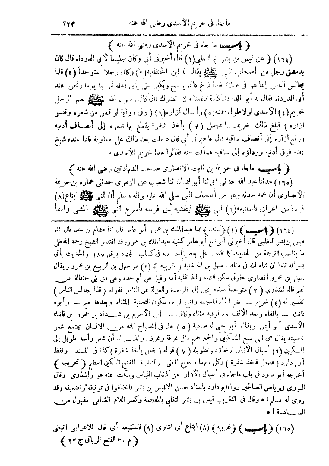 (164) (باب) (1) (سنده) ثنا عبد الملك بن عمرو أبو عامر قال ثنا هشام بن سعد قال ثنا قيس بن بشر التغلبى قال اخبرنى أبى الخ أبو عامر كنية عبد الملك بن عمرو وقد اقتصر الشيخ رحمه الله على ما يناسب الترجمة من الحديث كما اقتصر على بعض آخر منه فى كتاب الجهاد برقم 187 والحديث يأتى بسياقه تاما ان شاء الله فى مناقب سهل بن الحظلية (غريبه) (2) هو سهل بن الربيع بن عمرو ويقال سهل بن عمرو انصارى حارثى سكن الشام والحنظلية أمه وقيل هى أم جدخ وهى من بنى حنظلة من تميم قاله المنذرى (3) متواجداً معناه يميل إلى الوحدة والعزلة عن الناس فقوله (قلما يجالس الناس) تفسير له (4) خزيم -بضم الخاء المعجمة وفتح الراء وسكون التحتية المثناة وبعدها ميم- وأبوه فاتك -بالفاء وبعد الألف تاء فوقيه مثناة وكاف -ابن الأخرم بن شداد بن عمرو بن فاتك الأسدى أبو أيمن ويقال أبو يحيى له صحبة (5) قال فى المصباح الجمة من الانسان مجتمع شعر ناصيته يقال هى التى تبلغ المنكبين والجمع جمعهم مثل غرفة وغرف والمراد أن شعر رأسه طويل إلى المنكبين (6) أسبال الأزار ارخاؤه وتطويله (7) قوله (فجعل يأخذ شفرة) كذا فى المسند. ولفظ أبى داود (فجعل فاخذ شفرة) وكل منهما صحيح المعنى. والشفرة بالفتح السكين العظيم (تخريجه) أخرجه أبو داود فى باب ما جاء فى أسبال الأزار من كتاب اللباس وسكت عنه هو والمنذرى وقال النووى فى رياض الصالحين رواه ابو داود باسناد حسن الاقيس بن بشر فاختلفوا فى توثيقه وتضعيفه وقد روى له مسلم أهـ وقال فى التقريب قيس بن بشر التغلبى بالمعجمة وكسر اللام الشامى مقبول من السادسة أهـ.