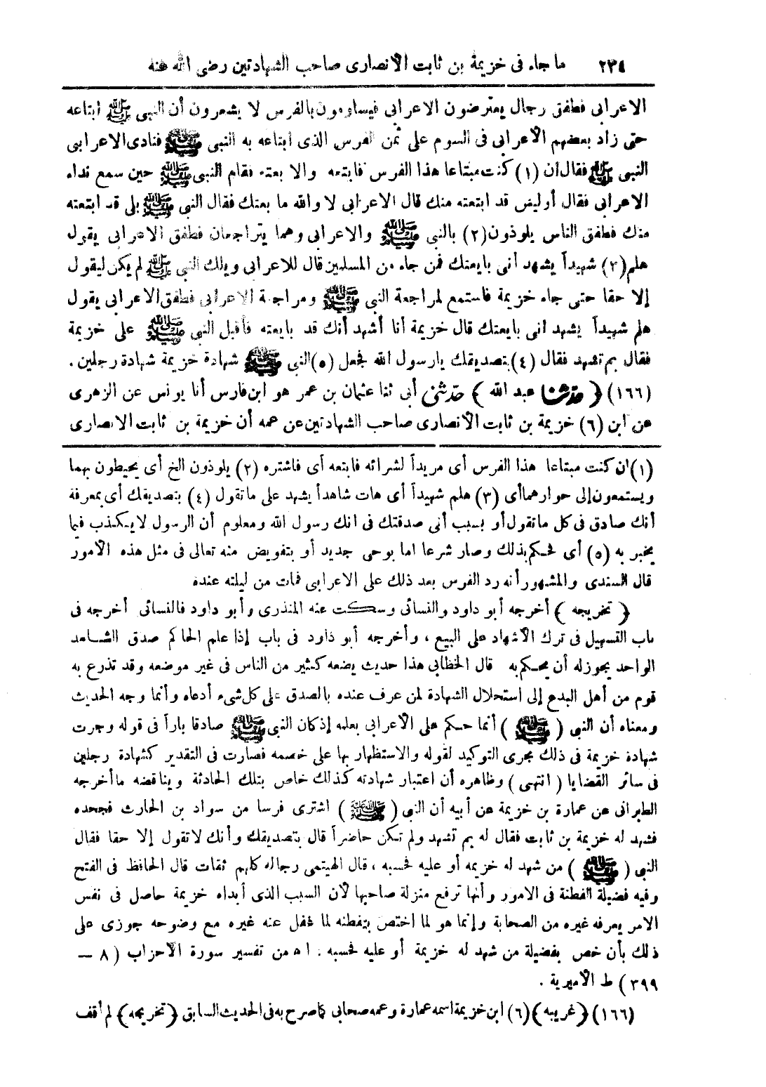 (1) إن كنت مبتاعًا هذا الفرس أى مريدا لشرائه فاتبعه اى فاشتراه (2) يلوذون الخ أى يحيطون بهما ويستمعون إلى حوارهما أى (3) هلم شهيداً أى هات شاهداً يشهد على ما تقول (4) بتصديقك أى بمعرفة أنك صادق فى كل ما تقول أو بسبب أنى صدقتك فى انك رسول الله ومعلوم أن الرسول لا يكذب فيما يخبر به (5) اى فحكم بذلك وصار شرعا اما بوحى جديد او بتفويض منه تعالى فى مثل هذه الامور قال السندى والمشهور أنه رد الفرس بعد ذلك على الاعرابى فمات من ليلته عنده.