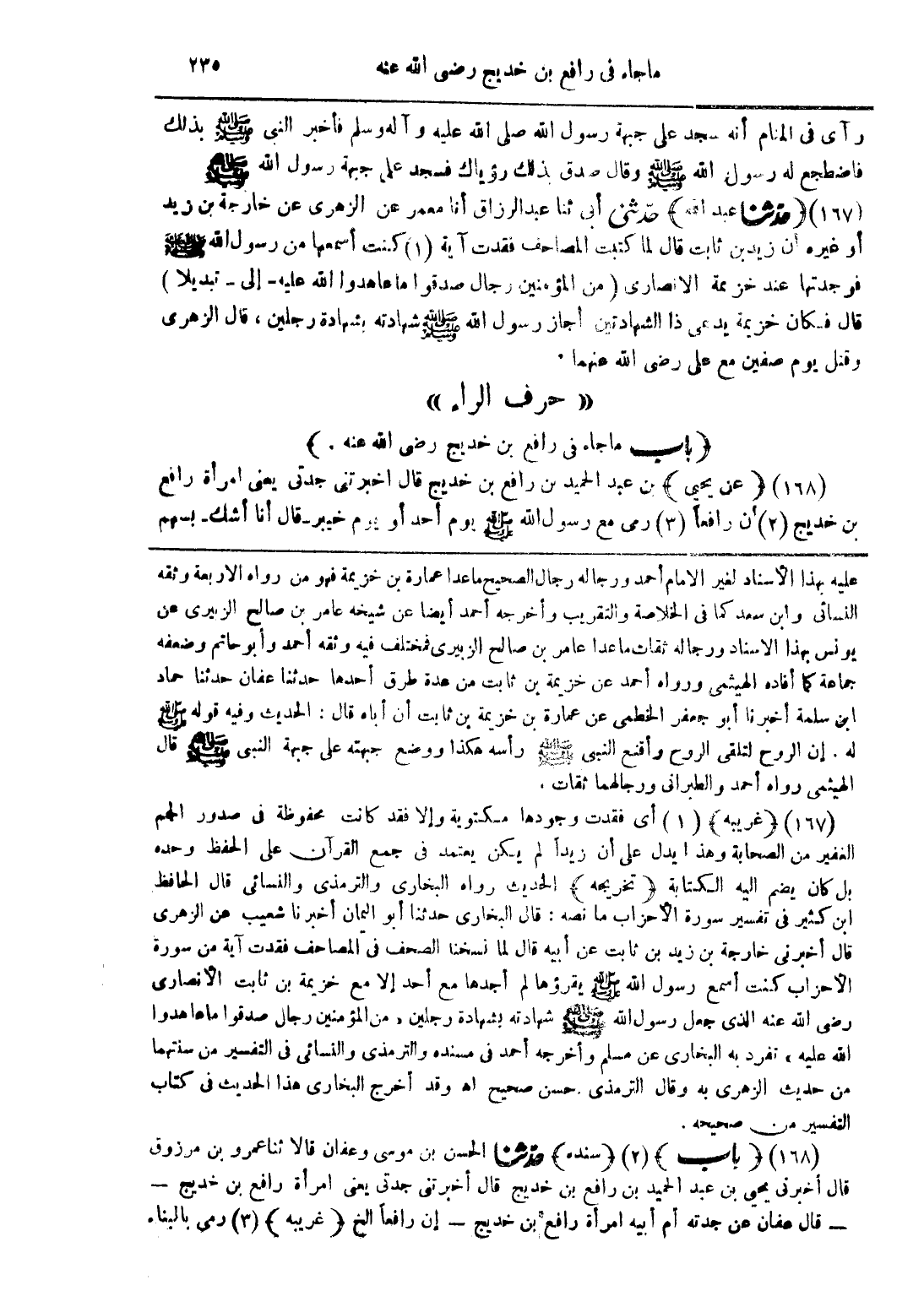 (168) (عن يحيى) بن عبد الحميد بن رافع بن خديج (2) قال اخبرتنى جدتى يعنى امرأة رافع بن خديج أن رافعًا (3) رمى مع رسول الله صلى الله عليه وسلم يوم أحد أو يوم خبير -قال أنا أشك- بسهم