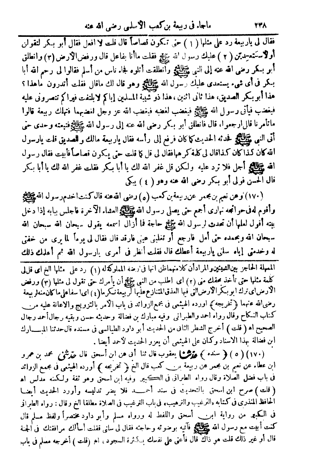 (170) وعن نعيم بن مجمر عن ربيعة بن كعب (5) رضى الله عنه قال كنت اخدم رسول الله صلى الله عليه وسلم وأقوم له فى حوائجه نهارى أجمعه حتى يصلى رسول الله صلى الله عليه وسلم العشاء الآخرة فاجلس ببابه إذا دخل بيته أقول لعلها أن تحدث لرسول الله صلى الله عليه وسلم حاجة فما أزال اسمعه يقول سبحان الله سبحان الله سبحان الله وبحمده حتى أمل فارجع أو تغلبنى عينى فارقد قال فقال لى يومًا لما يرى من خفتى له وخدمتى إياه سلنى يا ربيعة أعطك قال فقلت أنظر فى أمرى يا رسول الله ثم أعلمك ذلك