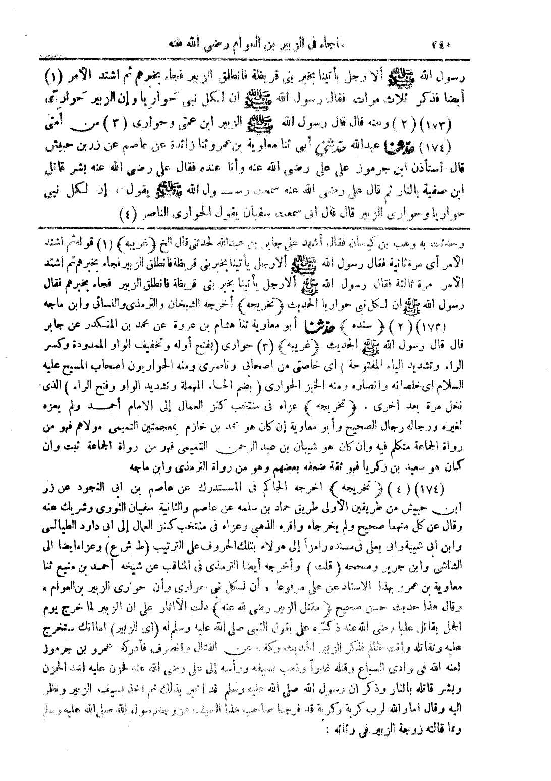 (173) (2) وعنه قال رسول الله صلى الله عليه وسلم الزبير ابن عمتى وحوارى (3) من أمتى حدّثنا عبد الله حدّثنى أبى ثنا معاوية بن عمر وثنا زائدة عن عاصم عن زربن حبيش قال استأذن ابن جرموز على على رضى الله عنه وأنا عنده فقال على رضى الله عنه بشر قاتل ابن صفية بالنار ثم قال على رضى الله عنه سمعت رسول الله صلى الله عليه وسلم يقول، إن لكل نبى حواريا وحوارى الزبير قال قال ابى سمعت سفيان يقول الحواري الناصر (4)