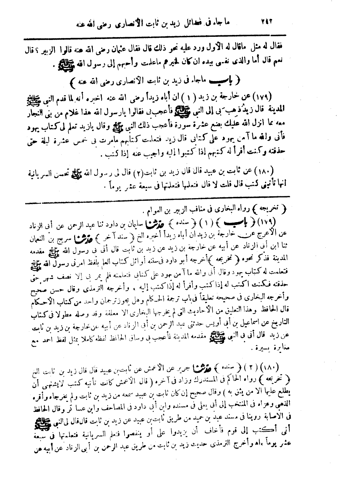 (179) عن خارجة بن زيد (1) ان أباه زيدًا رضى الله عنه اخبره أنه لما قدم النبى صلى الله عليه وسلم المدينة قال زيد ذهب بى إلى النبى صلى الله عليه وسلم فأعجب بى فقالوا يا رسول الله هذا غلام من بنى النجار معه مما انزل الله عليك بضع عشرة سورة فأعجب ذلك النبى صلى الله عليه وسلم وقال يا زيد تعلم لى كتاب يهود فأنى والله ما آمن يهود على كتابى قال زيد فتعلمت كتابهم ما مرت بى خمس عشرة ليلة حتى حذقته وكمنت اقرأ كتبهم إذا كتبوا إليه واجيب عنه (180) إذا كتب.