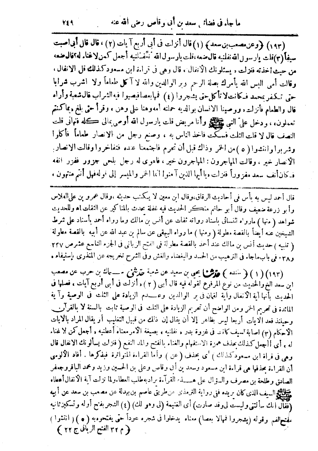 (193) (1) (سنده) حدّثنا يحيى بن سعيد عن شعبة حدّثنى سماك بن حرب عن مصعب ابن سعد الخ والحديث من نوع المرفوع لقوله فيه قال أبى (2) "أنزلت فى أبى أربع آيات" فصلها فى الحديث بأنها آية الأنفال واية لقمان فى بر الوالدين وعدم الزيادة على الثلث فى الوصية وآية المائدة فى تحريم الخمر ومن الواضح أن تحريم الزيادة على الثلث فى الوصية ثابت بالسنة لا بالقرآن وحينئذ فعد الايات أربعا ليس بظاهر إلا أن يقال إن ذلك من قبيل التغليب أو يقال المراد بالايات الأحكام (3) اصابة السيف كانت فى غزوة بدر "نفلنيه" بصيغة الأمر معناه أعطنيه "أجعل كمن لا غناء له" أى أأجعل كذلك بحذف همزة الاستفهام والغناء بالفتح والمد النفع (فنزلت يسألونك الانفال قال وهى فى قراة ابن مسعود كذلك) اى بحذف (عن) وأما القراءة المتواترة فبذكرها. أفاد الألوسى أن القراءة بحذفها هى قراءة ابن مسعود وسعد بن أبى وقاص وعلى بن الحسين وزيد ومحمد الباقر وجعفر الصادق وطلحة بن مصرف والسؤال على هذه القرآءة يراد به طلب العطاء ولما نزلت آية الأنفال أعطاه صلى الله عليه وسلم السيف الذى كان يريده ففى رواية الترمذى من طريق عاصم بن بهدلة عن مصعب بن سعد عن أبيه (فقال انك سألتنى وليست لى وقد صارت) أى الغنيمة (لى وهو لك) (4) الشجر بفتح أوله وتسكين ثانيه بفتح الفم وقوله (يشجروا فمهالا بعصا) معناه يدخلوا فى شجره عودًا حتى يفتحوه به (5) (انتشوا)