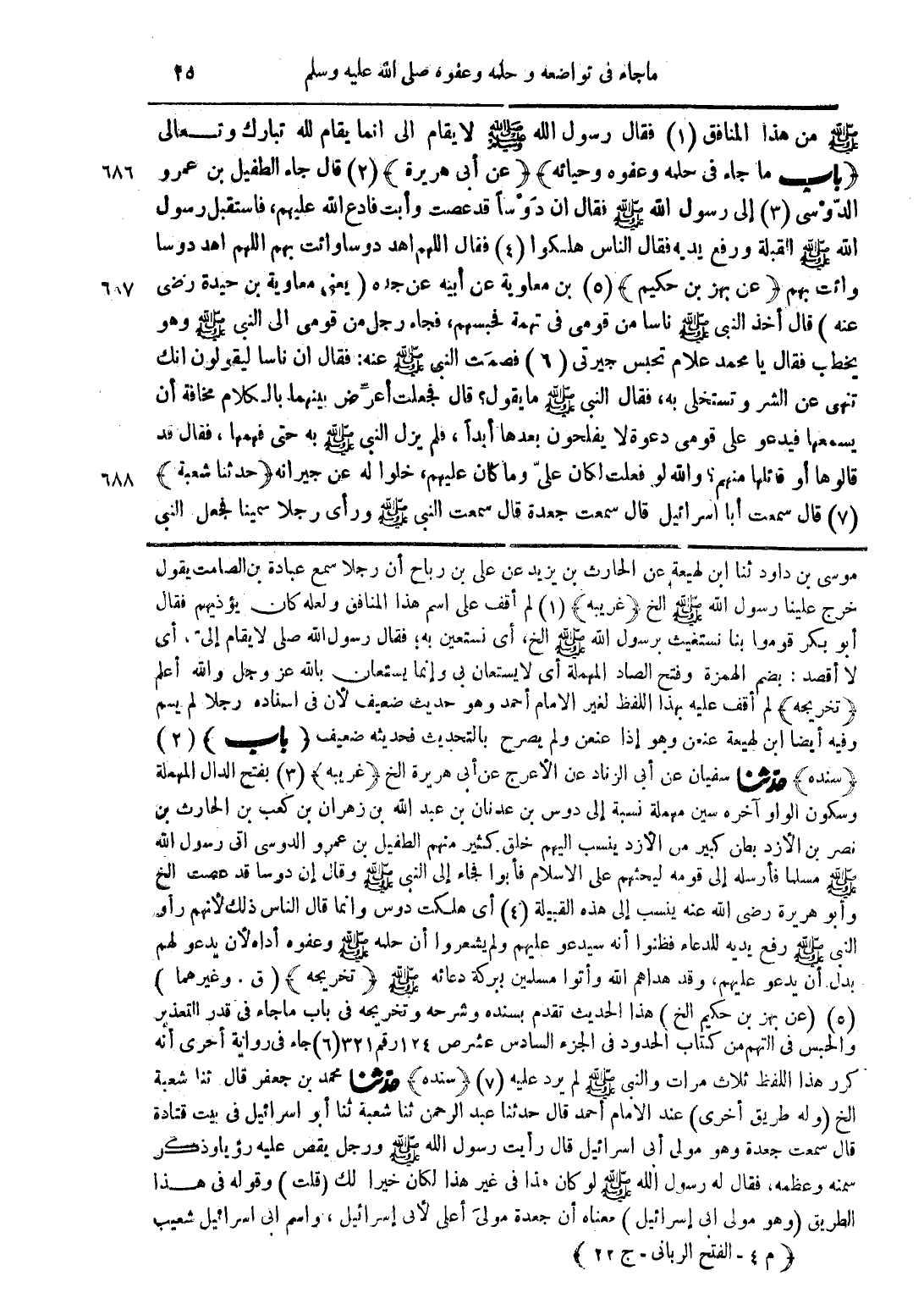 موسى بن داود ثنا ابن لهيعة عن الحارث بن يزيد عن علي بن رباح أن رجلا سمع عبادة بن الصامت يقول خرج علينا رسول الله صلى الله عليه وسلم الخ (غريبه) (1) لم أقف على اسم هذا المنافق ولعله كان يؤذيهم فقال أبو بكر قوموا بنا نستغيث برسول الله صلى الله عليه وسلم الخ، أي نستعين به؛ فقال رسول الله صلى الله عليه وسلم لا يقام إلىّ، أي لا أقصد: بضم الهمزة وفتح الصاد المهملة أي لا يستعان بي وإنما يستعان بالله عز وجل والله أعلم (تخريجه) لم أقف عليه بهذا اللفظ لغير الإمام أحمد وهو حديث ضعيف لأن في إسناده رجلا لم يسم وفيه أيضا ابن لهيعة عنعن وهو إذا عنهن ولم يصرح بالتحديث فحديثه ضعيف (باب) (2) (سنده) حدثنا سفيان عن أبي الزناد عن الأعرج عن أبي هريرة الخ (غريبه) (3) بفتح الدال المهملة وسكون الواو آخره سين مهملة نسبة إلى دوس بن عدنان بن عبد الله بن زهران بن كعب بن الحارث بن نصر بن الأزد بطن كبير من الأزد ينسب إليهم خلق. كثير منهم الطفيل بن عمرو الدوسي اتى رسول الله صلى الله عليه وسلم مسلما فأرسله إلى قومه ليحثهم على الإسلام فأبوا فجاء إلى النبي صلى الله عليه وسلم وقال إن دوسا قد عصت الخ وأبو هريرة رضي الله عنه ينسب إلى هذه القبيلة (4) أي هلكت دوس وإنما قال الناس ذلك لأنهم رأو النبي صلى الله عليه وسلم رفع يديه للدعاء فظنوا أنه سيدعو عليهم ولم يشعروا أن حله صلى الله عليه وسلم وعفوه أداه لأن يدعو لهم بدل أن يدعو عليهم، وقد هداهم الله وأتوا مسلمين ببركة دعائه صلى الله عليه وسلم (تخريجه) (ق. وغيرهما) (5) (عن بهز بن حكيم الخ) هذا الحديث تقدم بسنده وشرحه وتخريجه في باب ما جاء في قدر التعذير والحبس في التهم من كتاب الحدود في الجزء السادس عشر ص 124 رقم 321 (6) جاء في روانة أخرى أنه كرر هذا اللفظ ثلاث مرات والنبي صلى الله عليه وسلم لم يرد عليه (7) (سنده) حدثنا محمد بن جعفر قال ثنا شعبة الخ (وله طريق أخرى) عند الإمام أحمد قال حدثنا عبد الرحمن ثنا شعبة ثنا أبو إسرائيل في بيت قتادة قال سمعت جعدة وهو مولى أبي إسرائيل قال رأيت رسول الله صلى الله عليه وسلم ورجل يقص عليه رؤيا وذكر سمنه وعظمه، فقال له رسول الله صلى الله عليه وسلم لو كان هذا في غير هذا لكان خيرا لك (قلت) وقوله في هذا الطريق (وهو مولى إبي إسرائيل) معناه أن جعدة مولى أعلى لأبي إسرائيل، واسم إبي إسرائيل شعيب