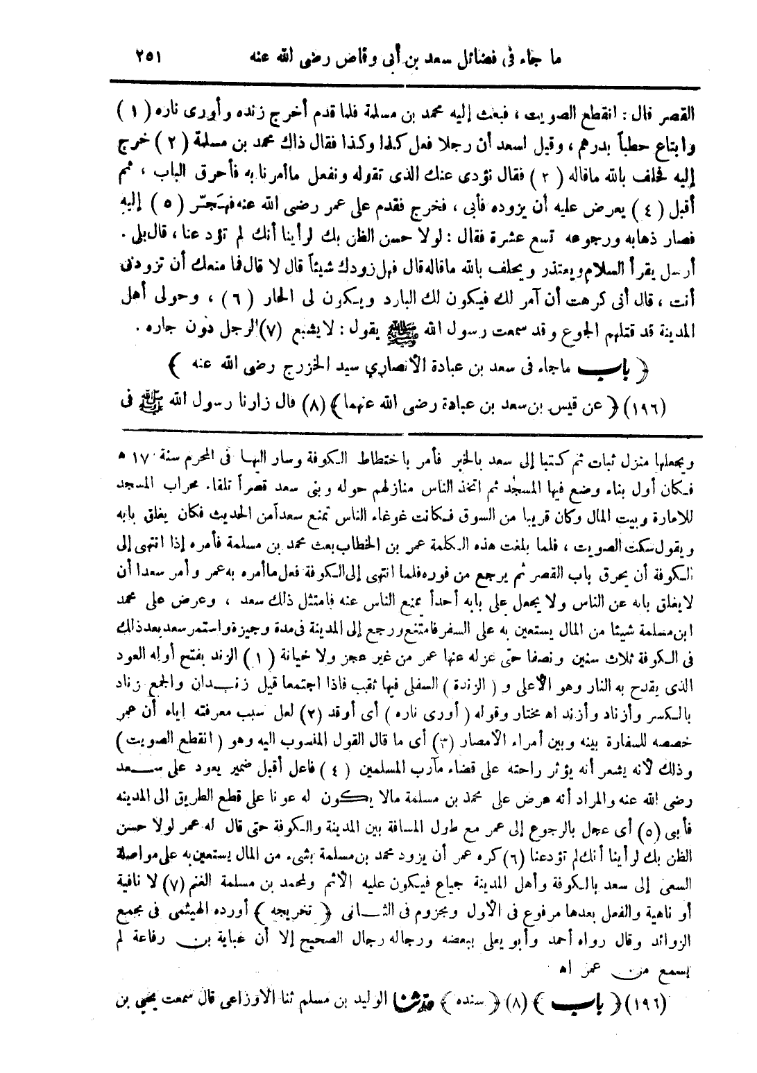ويجعلها منزل ثبات ثم كتبا إلى سعد بالخبر فأمر باختطاط الكوفة وسار اليها فى المحرم سنة 17 هـ فكان أول بناء وضع فيها المسجد ثم اتخذ الناس منازلهم حوله وبنى سعد قصرًا تلقا. محراب المسجد للامارة وبيت المال وكان قريبا من السوق فكانت غوغاء الناس تمنع سعدًا من الحديث فكان يغلق بابه ويقول سكت الصويت، فلما بلغت هذه الكلمة عمر بن الخطاب بعث محمد بن مسلمة فأمره إذا انتهى إلى الكوفة أن يحرق باب القصر ثم يرجع من فوه فلما انتهى إلى الكوفة فعل ما أمره به عمر وأمر سعدا أن لا يغلق بابه عن الناس ولا يجعل على بابه أحدًا يمنع الناس عنه فامتثل ذلك سعد، وعرض على محمد ابن مسلمة شيئا من المال يستعين به على السفر فامتنع ورجع إلى المدينة فى مدة وجيزة واستمر سعد بعد ذلك فى الكوفة ثلاث سنين ونصفا حتى عزله عنها عمر من غير عجز ولا خيانة (1) الزند بفتح أوله العود الذى يقدح به النار وهو الأعلى و (الزندة) السفلى فيها ثقب فاذا اجتمعا قيل زندان والجمع زناد بالكسر وأزناد وأزند اهـ مختار وقوله (أورى ناره) أى أوقد (2) لعل سبب معرفته اياه أن عمر خصصه للسفارة بينه وبين أمراء الأمصار (3) أى ما قال القول المنسوب اليه وهو (انقطع الصويت) وذلك لأنه يشعر أنه يؤثر راحته على قضاء مآرب المسلمين (4) فاعل أقبل ضمير يعود على سعد رضى الله عنه والمراد أنه عرض على محمد بن مسلمة ما لا يكون له عونا على قطع الطريق الى المدينه فأبى (5) أى عجل بالرجوع إلى عمر مع طول المسافة بين المدينة والكوفة حتى قال له عمر لولا حسن الظن بك لرأينا أنك لم تؤد عنا (6) كره عمر أن يزود محمد بن مسلمة بشئ من المال يستعين به على مواصلة السعى إلى سعد بالكوفة وأهل المدينة جياع فيكون عليه الأثم ولمحمد بن مسلمة الغنم (7) لا نافية أو ناهية والفعل بعدها مرفوع فى الأول ومجزوم فى الثانى (تخريجه) أورده الهيثمى فى مجمع الزوائد وقال رواه أحمد وأبو يعلى ببعضه ورجاله رجال الصحيح إلا أن عباية بن رفاعة لم يسمع من عمر اهـ