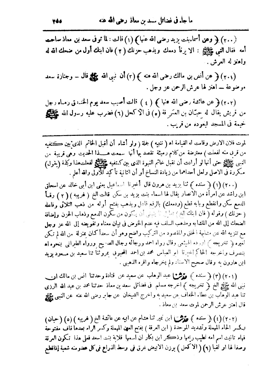 (200) (وعن أسماء بنت يزيد رضى الله عنها) قالت: لما توفى سعد بن معاذ ساحت أمه فقال النبى صلى الله عليه وسلم: الا يرقأ دمعك ويذهب حزنك فان ابنك أول من ضحك الله له واهتز له العرش.