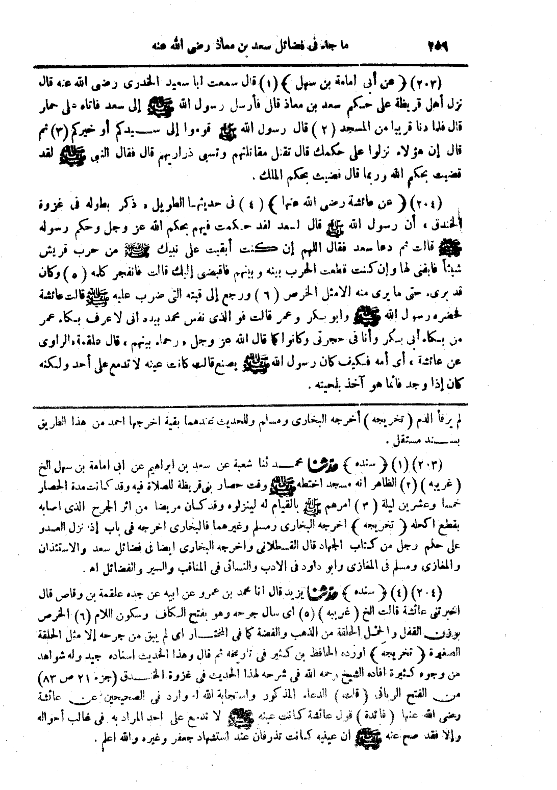 (203) (1) (سنده) حدّثنا محمد ثنا شعبة عن سعد بن ابراهيم عن ابى امامة بن سهل الخ (غريبه) (2) الظاهر انه مسجد اختطه صلى الله عليه وسلم وقت حصار بنى قريظة للصلاة فيه وقد كانت مدة الحصار خمسا وعشرين ليلة (3) امرهم صلى الله عليه وسلم بالقيام له لينزلوه وقد كان مريضا من اثر الجرح الذى اصابه بقطع اكحله (تخريجه) اخرجه البخارى ومسلم وغيرهما فالبخارى اخرجه فى باب إذا نزل العدو على حكم رجل من كتاب الجهاد قال القسطلانى واخرجه البخارى ايضا فى فضائل سعد والاستئذان والمغازى ومسلم فى المغازى وابو داود فى الادب والنسائى فى المناقب والسير والفضائل اهـ.