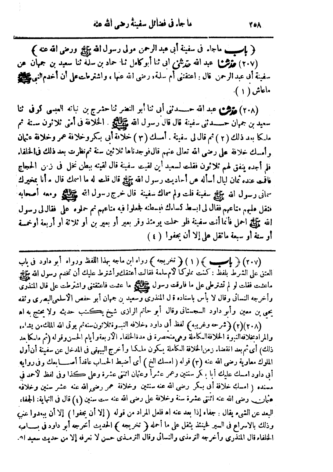 (208) حدّثنا عبد الله حدثنى أبى ثنا أبو النضر ثنا حشرج بن نباته العبسى كوفى ثنا سعيد بن جمهان حدثنى سفينة قال قال رسول الله صلى الله عليه وسلم. الخلافة فى أمتى ثلاثون سنة ثم ملكا بعد ذلك ثم قال لى سفينة. أمسك خلافة أبى بكر وخلافة عمر وخلافة عثمان وأمسك خلافة على رضى الله تعالى عنهم قال فوجدناها ثلاثين سنة ثم نظرت بعد ذلك فى الخلفاء فلم أجده ينفق لهم ثلاثون فقلت لسعيد أين لقيت سفينة قال لقيته ببطن نخل فى زمن الحجاج فاقمت عنده ثمان ليال أسأله عن أحاديث رسول الله صلى الله عليه وسلم قال قلت له ما اسمك قال ما أنا بمخبرك سمانى رسول الله صلى الله عليه وسلم سفينة قلت ولم سماك سفينة قال خرج رسول الله صلى الله عليه وسلم ومعه أصحابه فثقل عليهم متاعهم فقال لى ابسط كساءك فبسطنه فجعلوا فيه متاعهم ثم حملوه على فقال لى رسول الله صلى الله عليه وسلم احمل فأنما أنت سفينة فلو حملت يومئذ وقر بعير أو بعيرين او ثلاثة او أربعة او خمسة أو ستة أو سبعة ما ثقل على إلا أن يجفوا