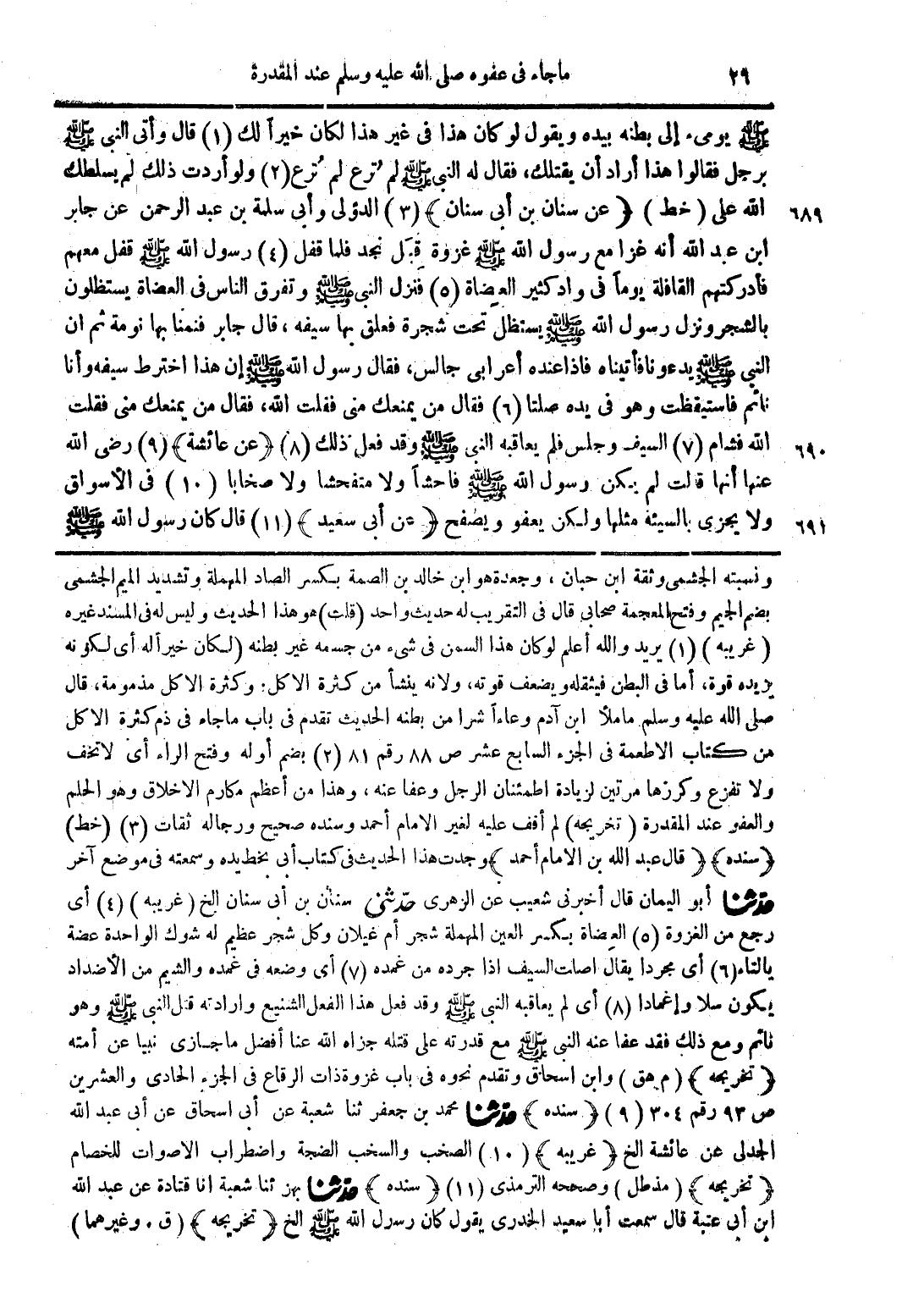 ونسبته الجشمى وثقة ابن حبان، وجعدة هو ابن خالد بن الصمة بكسر الصاد المهملة وتشديد الميم الجشمى بضم الجيم وفتح المعجمة صحابي قال في التقريب له حديث واحد (قلت) هو هذا الحديث وليس له في المسند غيره (غريبة) (1) يريد والله أعلم لو كان هذا السمن في شيء من جسمه غير بطنه (لكان خير أله أي لكونه يزيده قوة، أما في البطن فيثقله ويضعف قوته، ولأنه ينشأ من كثرة الأكل. وكثرة الأكل مذمومة، قال صلى الله عليه وسلم ما ملأ ابن آدم وعاءًا شرا من بطنه الحديث تقدم في باب ما جاء في ذم كثرة الأكل من كتاب الأطعمة في الجزء السابع عشر ص 88 رقم 81 (2) بضم أوله وفتح الراء أي لا تخف ولا تفزع وكرزها مرتين لزيادة اطمئنان الرجل وعفا عنه، وهذا من أعظم مكارم الاخلاق وهو الحلم والعفو عند المقدرة (تخريجه) لم أقف عليه لغير الإمام أحمد وسنده صحيح ورجاله ثقات (3) (خط) (سنده) (قال عبد الله بن الإمام أحمد) وجدت هذا الحديث في كتاب أبي بخط يده وسمعته في موضع آخر حدثنا أبو اليمان قال أخبرني شعيب عن الزهري حدثني سنان بن أبي سنان الخ (غريبه) (4) أي رجع من الغزوة (5) العضاة بكسر العين المهملة شجر أم غيلان وكل شجر عظيم له شوك الواحدة عضة بالتاء (6) أي مجردا يقال اصلت السيف إذا جرده من غمده (7) أي وضعه في غمده والشيم من الأضداد يكون سلا واغمادا (8) أي لم يعاقبه النبي صلى الله عليه وسلم وقد فعل هذا الفعل الشنيع وارادته قتل النبي صلى الله عليه وسلم وهو نائم ومع ذلك فقد عفا عنه النبي صلى الله عليه وسلم مع قدرته على قتله جزاه الله عنا أفضل ما جازى نبيا عن أمته (تخريجه) (م هق) وابن إسحاق وتقدم نحو في باب غزوة ذات الرقاع في الجزء الحادي والعشرين ص 93 رقم 304 (9) (سنده) حدثنا محمد بن جعفر ثنا شعبة عن أبي إسحاق عن أبي عبد الله الجدلي عن عائشة الخ (غريبه) (10) الصخب والسخب الضجة واضطراب الاصوات للخصام (تخريجه) (مذ طل) وصححه الترمذي (11) (سنده) حدثنا بهز ثنا شعبة أنا قتادة عن عبد الله ابن أبي قال سمعت أبا سعيد الخدري يقول كان رسول الله صلى الله عليه وسلم الخ (تخريجه) (ق. وغيرهما)