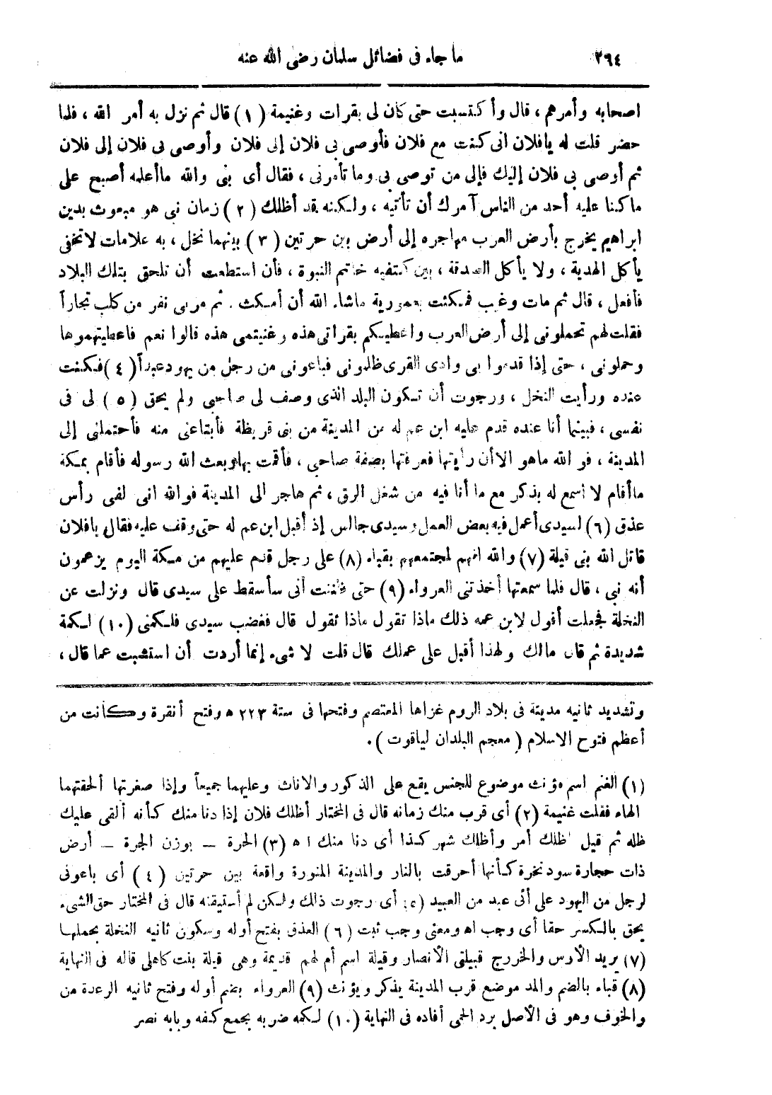 (1) اسم مؤنث موضوع للجنس يقع على الذكور والاناث وعليهما جميعًا وإذا صغرتها ألحقتهما الهاء فقلت غنيمة (2) أى قرب منك زمانه قال فى المختار أظللك فلان إذا دنا منك كأنه ألقى عليك ظله ثم قيل ظلك وأظلك شهركذا أى دنا منك اهـ (3) الحرة -بوزن الجرة- أرض ذات حجارة سود نخرة كأنها أحرقت بالنار والمدينة المنورة واقعة بين حرتين (4) أى باعونى لرجل من اليهود على أنى عبد من العبيد (5) أى رجوت ذلك ولكن لم أستيقنه قال فى المختار حق الشئ يحق بالكسر حقا أى وجب اهـ ومعنى وجب ثبت (6) العذق بفتح أوله وسكون ثانيه النخلة بحملها (7) يريد الأوس والخزرج قبيلتى الأنصار وقيلة اسم أم لهم قديمة وهى قيلة بنت كاهلى قاله فى النهاية (8) قباء بالضم والمد موضع قرب المدينة يذكر ويؤنث (9) العرواء بضم أوله وفتح ثانيه الرعدة من والخوف وهو فى الأصل برد الحمى أفاده فى النهاية (10) لكمه ضربه بجمع كفه وبابه نصر