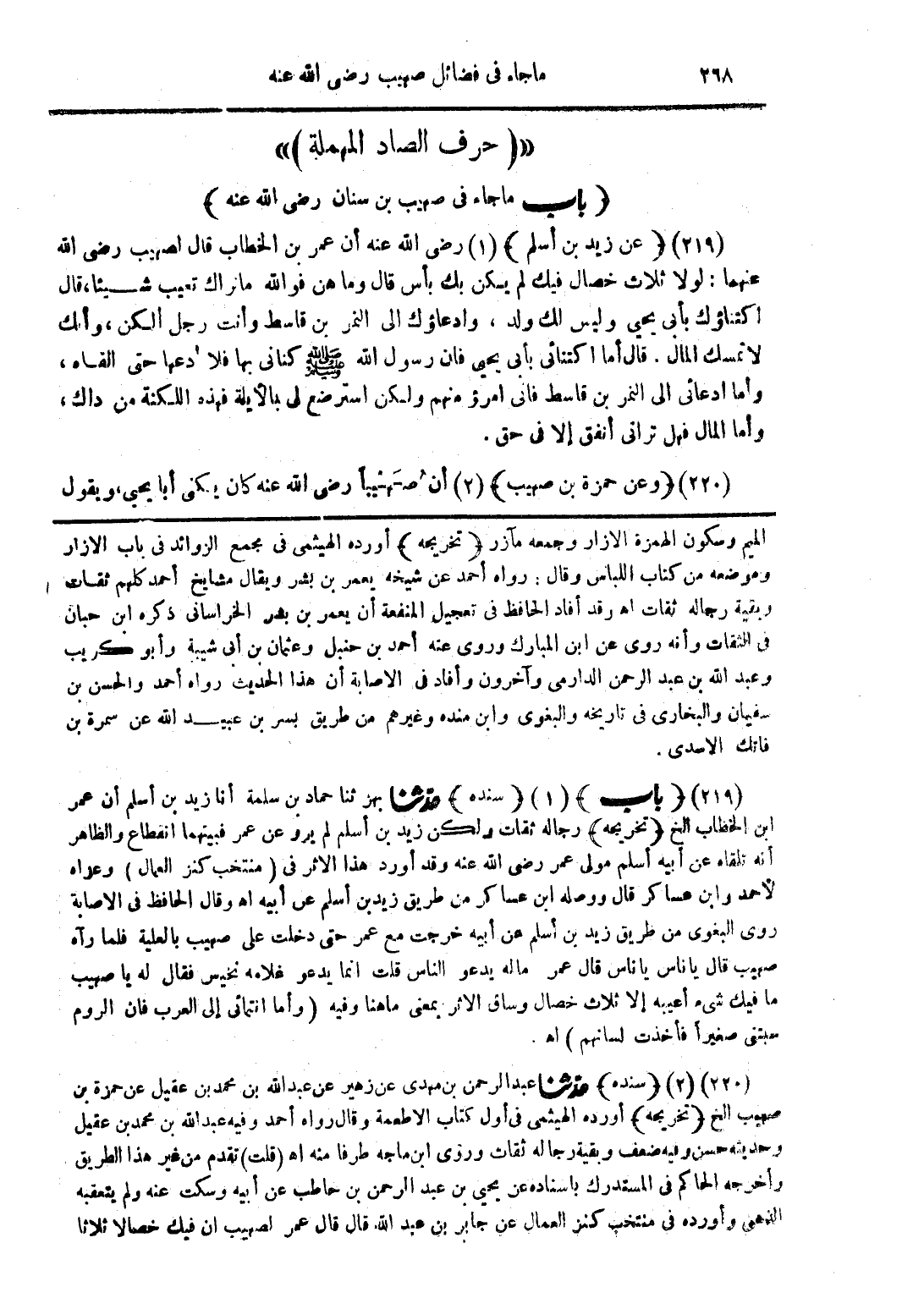 (219) (باب) (1) (سنده) حدّثنا بهز ثنا بن سلمة أنا زيد بن أسلم أن عمر ابن الخطاب الخ (تخريجه) رجاله ثقات ولكن زيد بن أسلم لم يرو عن عمر فبينهما انقطاع والظاهر أنه تلقاه عن أبيه أسلم مولى عمر رضى الله عنه وقد أورد هذا الاثر فى (منتخب كنز العمال) وعزاه لأحمد وابن عساكر قال ووصله ابن عساكر من طريق زيد بن أسلم عن أبيه اهـ وقال الحافظ فى الاصابة روى البغوى من طريق زيد بن أسلم عن أبيه خرجت مع عمر حتى دخلت على صهيب بالعلية فلما رآه صهيب قال يا ناس يا ناس قال عمر ما له يدعو الناس قلت انما يدعو غلامه نخيس فقال له يا صهيب ما فيك شئ أعيبه إلا ثلاث خصال وساق الاثر بمعنى ما هنا وفيه (وأما انتمائى إلى العرب فان الروم سبتنى صغيرًا فأخذت لسانهم) اهـ.