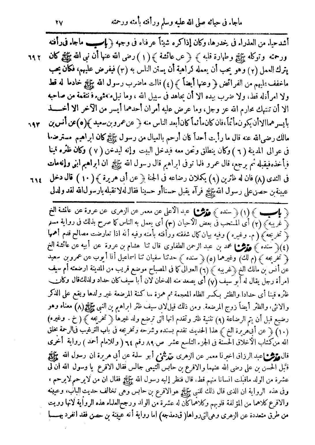 (باب) (1) (سنده) حدثنا عبد الأعلى عن معمر عن الزهري عن عروة عن عائشة الخ (غريبه) (2) أي المستحب في بعض الأحيان (3) أي يعمل به الناس كما صرح بذلك في رواية مسلم (تخريجه) (م. وغيره) وفيه بيان كمال شفقته ورأفته بأمته وفيه أنه إذا تعارضت مصالح قدم أهمها (4) (سنده) حدثنا محمد بن عبد الرحمن الطفاوي قال ثنا هشام بن عروة عن أبيه عن عائشة الخ (تخريجه) (م لك) وغيرهما (5) (سنده) حدثنا سفيان ثنا إسماعيل أنا أيوب عن عمرو بن سعيد عن أنس بن مالك الخ (غريبه) (6) العوالى كما في المصباح موضع قريب من المدينة أرضعته أم سيف امرأة رجل يقال له أبو سيف (7) أي يصعد منه الدخان لأن أبا سيف كان حداد ولذلك قال وكان ظئره قينا أي حدادا والظئر بكسر الظاء المعجمة ثم همزة ساكنة المرضعة غير ولدها ويقع على الذكر والأنثى، والظئر أيضًا زوج المرضعة. ومن ذلك قيل لأبي سيف ظئر إبراهيم بن النبي صلى الله عليه وسلم (8) معناه وهو رضيع قبل أن يتم الرضاعة (9) تثنية ظثر وتقدم أنها التي ترضع ولد غيرها (تخريجه) (خ. وغيره) (10) (عن أبي هريرة الخ) هذا الحديث تقدم بسنده وشرحه وتخريجه في باب الترغيب في الرحمة بخلق الله من كتاب الأخلاق الحسنة في الجزء التاسع عشر ص 89 رقم 64 (وللإمام أحمد) رواية أخرى قال حدثنا عبد الرزاق اخبرنا معمر عن الزهري حدثني أبو سلمة عن أبي هريرة أن رسول الله صلى الله عليه وسلم قبل الحسن بن علي رضي الله عنهما والأقرع بن حابس التيمي جالس فقال الأقرع يا رسول الله أن لي عشرة من الولد ما قبلت انسانا منهم قط، قال فنظر إليه رسول الله صلى الله عليه وسلم فقال أن من لا يرحم لا يرحم، وفي هذه الرواية أن الذي قال ذلك للنبي صلى الله عليه وسلم هو الأقرع بن حابس وهي تخالف حديث الباب، وعينه والأقرع كلاهما من المؤلفة قلوبهم وكلاهما كان له عشرة من الولد ورجح العلماء هذه الرواية لأنها رويت من طرق متعددة عن الزهري وهي التي رواها (ق د مذ جه) أما رواية أنه عيينة بن حصن فقد انفرد بها