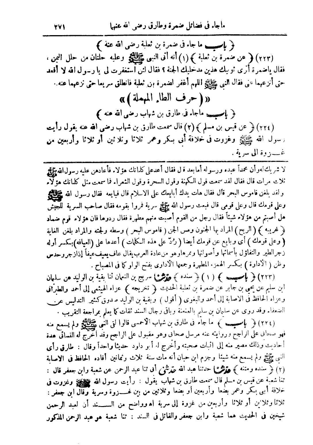 (224) (باب) ما جاء فى طارق بن شهاب الأحمسى قالوا لقى النبى صلى الله عليه وسلم ولم يسمع منه فهو صحابى على الراجح وروايته عنه مرسل صحابى وهو مقبول على الراجح وقد أخرج له النسائى عدة أحاديث وذلك مصير منه إلى اثبات صحبته وأخرج له أبو داود حديثا واحدًا وقال: طارق رأى النبى صلى الله عليه وسلم ولم يسمع منه شيئا وجزم ابن حبان أنه مات سنة ثلاث وثمانين أفاده الحافظ فى الاصابة (2) (سنده ومتنه) حدّثنا حدثنا عبد الله حدّثنى أبى ثنا عبد الرحمن عن شعبة وابن جعفر قال: ثنا شعبة عن قيس بن مسلم قال سمعت طارق بن شهاب يقول: رأيت رسول الله صلى الله عليه وسلم وغزوت فى خلافة أبى بكر وعمر بضعا وأربعين أو بضعا وثلاثين من بين غزوة وسرية وقال ابن جعفر: ثلاثا وثلاثين أو ثلاثا وأربعين من غزوة إلى سرية اهـ وواضح من السند أن لعبد الرحمن شيخين فى الحديث هما شعبة وابن جعفر والقائل فى السند: ثنا شعبة هو عبد الرحمن المذكور