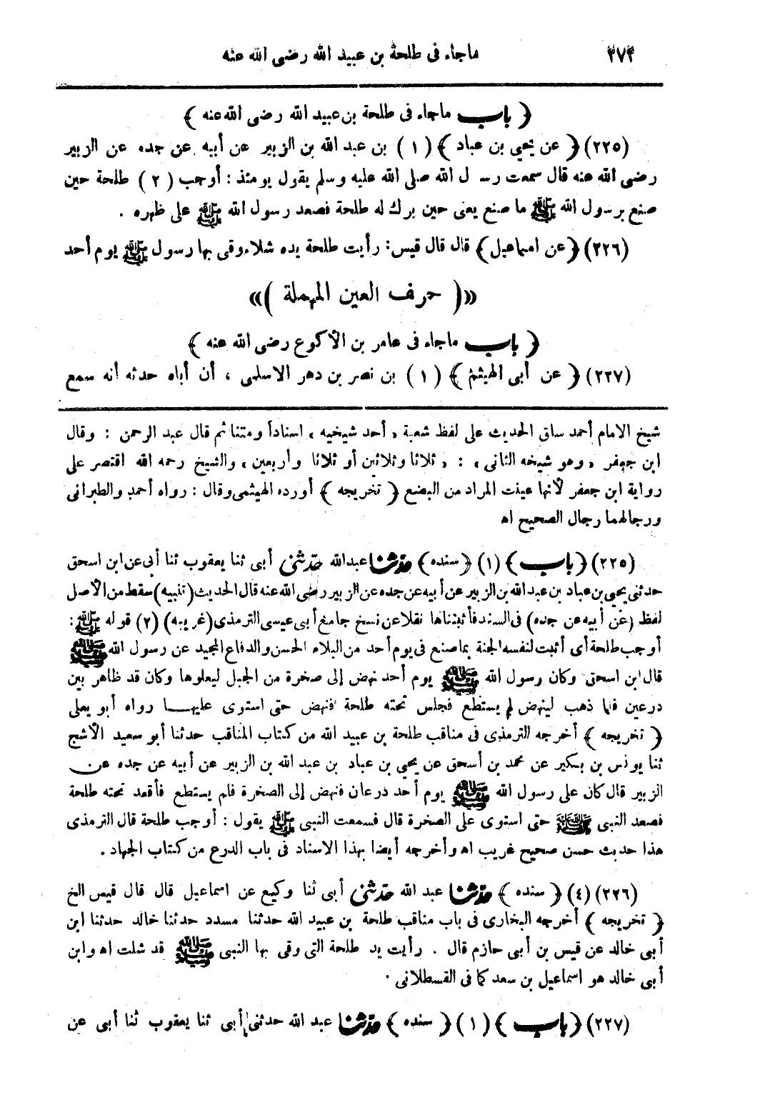 (225) (عن يحيى بن عباد) بن عبد الله بن الزبير عن أبيه عن جده عن الزبير رضى الله عنه قال سمعت رسول الله صلى الله عليه وسلم يقول يومئذ: أوجب طلحة حين صنع برسول الله صلى الله عليه وسلم ما صنع يعنى حين برك له طلحة فصعد رسول الله صلى الله عليه وسلم على ظهره.