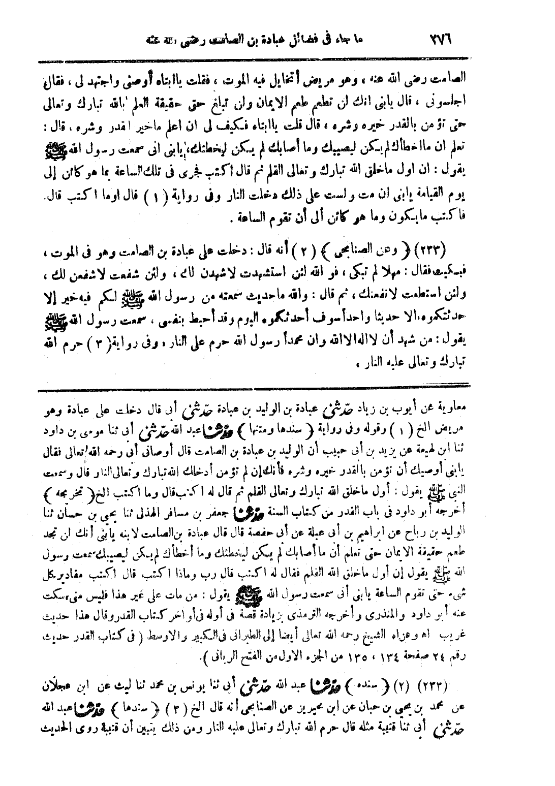 (233) (وعن الصنابحى) أنه قال: دخلت على عبادة بن الصامت وهو فى الموت، فبكيت فقال: مهلا لم تبكى، فوالله لئن استشهدت لاشهدن لك، ولئن شفعت لاشفعن لك، ولئن استطعت لانفعنك، ثم قال: والله ما حديث سمعته من رسول الله صلى الله عليه وسلم لكم فيه خير إلا حدثتكموه، الا حديثا واحدًا سوف أحدثكموه اليوم، وقد أحيط بنفسى، سمعت رسول الله صلى الله عليه وسلم يقول: من شهد أن لا اله الا الله وان محمدًا رسول الله حرم على النار "وفى رواية حرم الله تبارك وتعالى عليه النار"
