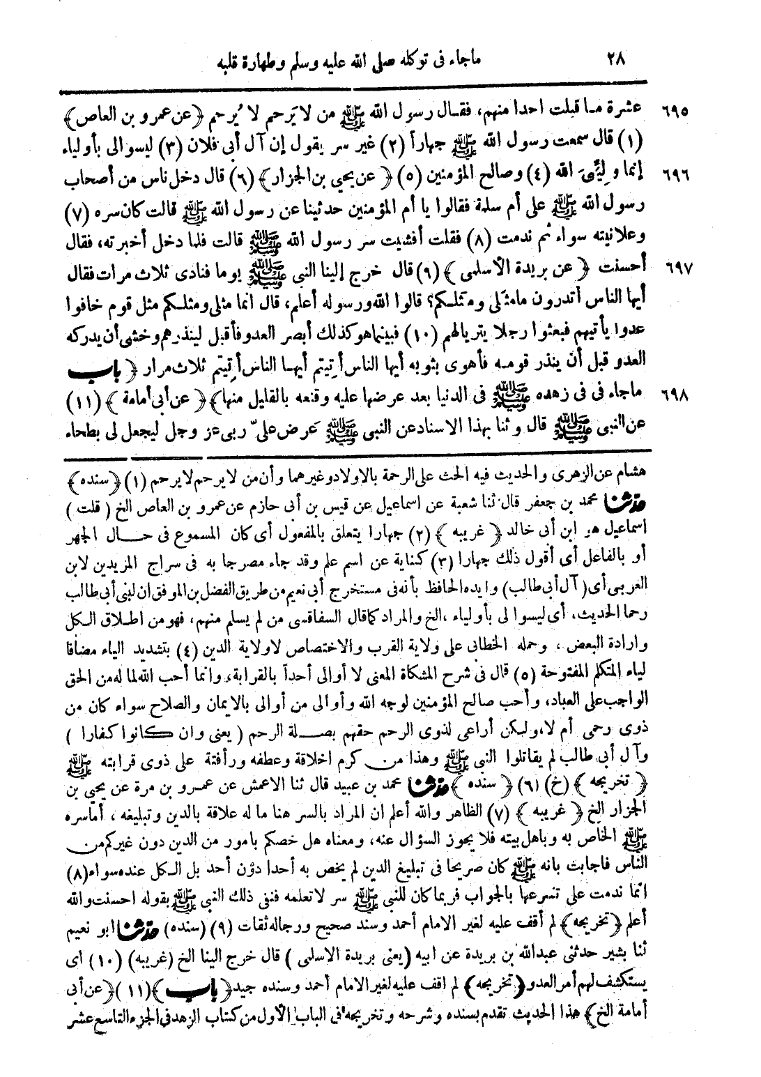 هشام عن الزهري والحديث فيه الحث على الرحمة بالاولاد وغيرهما وأن من لا يرحم لا يرحم (1) (سنده) حدثنا محمد بن جعفر قال ثنا شعبة عن إسماعيل عن قيس بن أبي حازم عن عمرو بن العاص الخ (قلت) إسماعيل هو ابن أبي خالد (غريبه) (2) جهارا يتعلق بالمفعول أي كان المسموع في حال الجهر أو بالفاعل أي أقول ذلك جهارا (3) كناية عن اسم علم وقد جاء مصر جا به في سراج المريدين لابن العربي أي (آل أبي طالب) وايده الحافظ بأنه في مستخرج أبي نهعيم من طريق الفضل بن الموفق أن لبني أبي طالب رحما الحديث، أي ليسوا لي بأولياء، الخ والمراد كما قال السفاقسي من لم يسلم منهم، فهو من اطلاق الكل وارادة البعض، وحمله الخطابي على ولاية القرب والاختصاص لا ولاية الدين (4) بتشديد الياء مضافا لياء المتكلم المفتوحة (5) قال في شرح المشكاة المعنى لا أوالى أحدًا بالقرابة، وإنما أحب الله لما له من الحق الواجب على العباد، وأحب صالح المؤمنين لوجه الله وأوالى من أوالى بالإيمان والصلاح سواء كان من ذوى رحمى أم لا، ولكن أراعي لذوى الرحم حقهم بصلة الرحم (يعني وأن كانوا كفارا) وآل أبي طالب لم يقاتلوا النبي صلى الله عليه وسلم وهذا من كرم إخلاقه وعطفه ورأفتة على ذوى قرابته صلى الله عليه وسلم (تخريجه) (خ) (6) (سنده) حدثنا محمد بن عبيد قال ثنا الاعمش عن عمرة بن مرة عن يحيى بن الجزار الخ (غريبه) (7) الظاهر والله أعلم أن المراد بالسر هنا ما له علاقة بالدين وتبليغه، أما سره صلى الله عليه وسلم الخاص به وباهل بيته فلا يجوز السؤال عنه، ومعناه هل هصكم بامور من الدين دون غيركم من الناس فاجابت بانه صلى الله عليه وسلم كان صريحا في تبليغ الدين لم يخص به أحدا دون أحد بل الكل عنده سواء (8) إنما ندمت على تسرعها بالجواب فربما كان للنبي صلى الله عليه وسلم سر لا تعلمه فنفى ذلك النبي صلى الله عليه وسلم بقوله احسنت والله أعلم (تخريجه) لم أقف عليه لغير الإمام أحمد وسند صحيح ورجاله ثقات (9) (سنده) حدثنا أبو نعيم ثنا بشير حدثني عبد الله بن بريدة عن أبيه (يعني بريدة الاسلمي) قال خرج الينا الخ (غريبه) (10) أي يستكشف لهم أمر العدو (تخريجه) لم أقف عليه لغير الإمام أحمد وسنده جيد (باب) (11) (عن أبي أمامة الخ) هذا الحديث تقدم بسنده وشرحه وتخريجخ في الباب الأول من كتاب الزهد في الجزء التاسع عشر