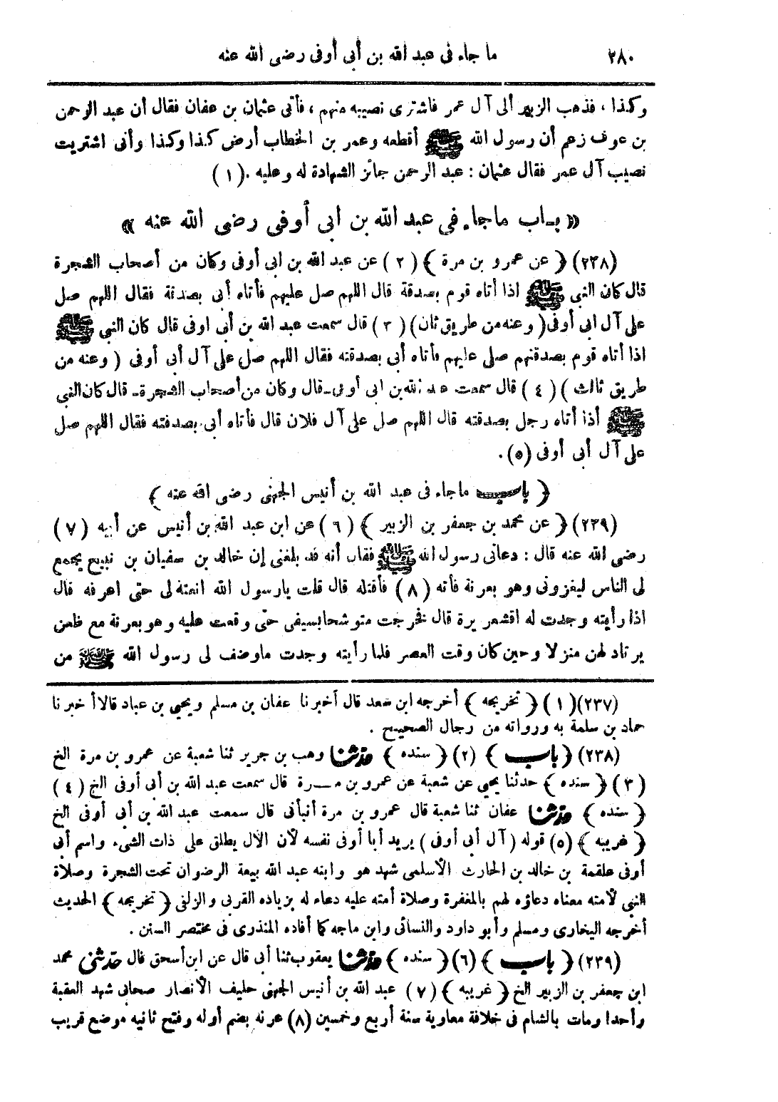 (238) (باب) (2) (سنده) حدّثنا وهب بن جرير ثنا شعبة عن عمرو بن مرة الخ (3) (سنده) حدثنا يحيى عن شعبة عن عمرو بن مرة قال سمعت عبد الله بن أبى أوفى الخ (4) (سنده) حدّثنا عفان ثنا شعبة قال عمرو بن مرة أنبأنى قال سمعت عبد الله بن أبى أوفى الخ (غريبه) (5) قوله (آل أبى أوفى) يريد أبا أوفى نفسه لأن الال يطلق على ذات الشئ واسم أبى أوفى علقمة بن خالد بن الحارث الأسلمى شهد هو وابنه عبد الله بيعة الرضوان تحت الشجرة وصلاة النبى لأمته معناه دعاؤه لهم بالمغفرة وصلاة أمته عليه دعاء له بزيادة القربى والزلفى (تخريجه) الحديث أخرجه البخارى ومسلم وأبو داود والنسائى وابن ماجه كما أفاده المنذرى فى مختصر السنن.