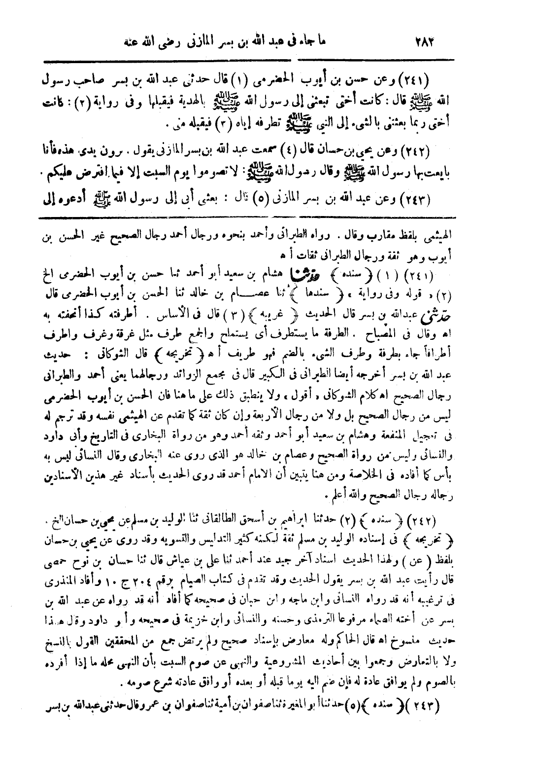 (241) وعن حسن بن أيوب الحضرمى قال حدثنى عبد الله بن بسر صاحب رسول الله صلى الله عليه وسلم قال: كانت أختى تبعثنى إلى رسول الله صلى الله عليه وسلم بالهدية فيقبلها وفى رواية: كانت أختى ربما بعثتنى بالشئ إلى النبى صلى الله عليه وسلم تطرفه إياه فيقبله منى.
