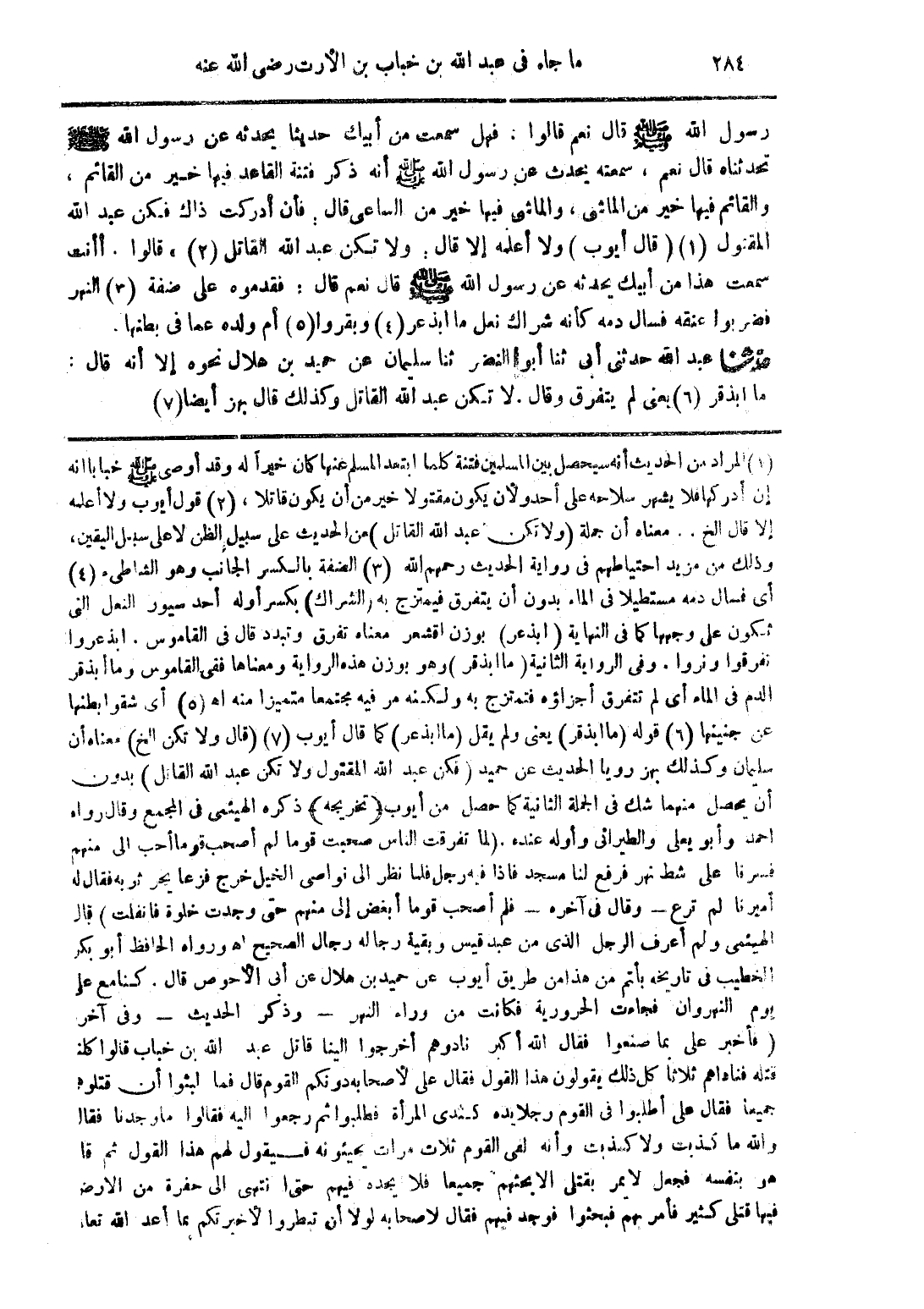 (1) المراد من الحديث أنه سيحصل بين المسلمين فتنة كلما ابتعد المسلم عنها كان خيرًا له وقد أوصى صلى الله عليه وسلم خبابا انه إن أدركها فلا يشهر سلاحه على أحد ولأن يكون مقتولا خير من أن يكون قاتلا، (2) قول أيوب ولا أعلمه إلا قال الخ .. معناه أن جملة (ولا تكن عبد الله القاتل) من الحديث على سبيل الظن لا على سبيل اليقين، وذلك من مزيد احتياطهم فى رواية الحديث رحمهم الله (3) الضفة بالكسر الجانب وهو الشاطئ (4) أى فسال دمه مستطيلا فى الماء بدون أن يتفرق فيمتزج به (الشراك) بكسر أوله أحد سيور النعل التى تكون على وجهها كما فى النهاية (ابذعر) بوزن اقشعر معناه تفرق وتبدد قال فى القاموس. ابذعروا تفرقوا وفروا. وفى الرواية الثانية (ما ابذقر) وهو بوزن هذه الرواية ومعناها ففى القاموس وما أبذقر الدم فى الماء أى لم تتفرق أجزاؤه فتمتزج به ولكنه مر فيه مجتمعا متميزا منه اهـ (5) أى شقوا بطنها عن جنينها (6) قوله (ما ابذقر) يعنى ولم يقل (ما ابذعر) كما قال أيوب (7) (قال ولا تكن الخ) معناه أن سليمان وكذلك بهز رويا الحديث عن حميد (فكن عبد الله المقتول ولا تكن عبد الله القاتل) بدون أن يحصل منهما شك فى الجملة الثانية كما حصل من أيوب (تخريجه) ذكره الهيثمى فى المجمع وقال رواه احمد وأبو يعلى والطبرانى وأوله عنده. (لما تفرقت الناس صحبت قوما لم أصحب قوما أحب الى منهم فسرنا على شط نهر فرفع لنا مسجد فاذا فيه رجل فلما نظر الى نواصى الخيل خرج فزعا يجر ثوبه فقال له أميرنا لم ترع -وقال فى آخره- فلم أصحب قوما أبغض إلى منهم حتى وجدت خلوة فانفلت) قال الهيثمى ولم أعرف الرجل الذى من عبد قيس وبقية رجاله رجال الصحيح اهـ ورواه الحافظ أبو بكر الخطيب فى تاريخه بأتم من هذا من طريق أيوب عن حميد بن هلال عن أبى الأحوص قال. كنا مع على يوم النهروان فجاءت الحرورية فكانت من وراء النهر -وذكر الحديث- وفى آخر (فأخبر على بما صنعوا فقال الله أكبر نادوهم أخرجوا الينا قاتل عبد الله بن خباب قالوا كلنا قتله فناداهم ثلاثا كل ذلك يقولون هذا القول فقال على لأصحابه دونكم القوم قال فما لبثوا أن قتلوهم جميعا فقال على أطلبوا فى القوم رجلا يده كثدى المرأة فطلبوا ثم رجعوا اليه فقالوا ما وجدنا فقال والله ما كذبت ولا كذبت وأنه لفى القوم ثلاث مرات يجيئونه فيقول لهم هذا القول ثم قام هو بنفسه فجعل لا يمر بقتلى الا يحثهم جميعا فلا يجده فيهم حتى انتهى الى حفرة من الارض فيها قتلى كثير فأمر بهم فبحثوا فوجد فيهم فقال لاصحابه لولا أن تبطروا لأخبرتكم بما أعد الله تعالى