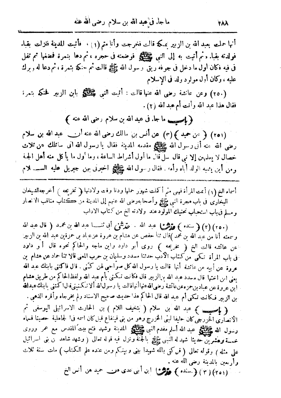 (باب) عبد الله بن سلام (بتخيف اللام) بن الحارث الاسرائيلى اليوسفى ثم الأنصارى الخزرجى كان حليفا لبنى الخزرج وهو من بنى قينقاع قيل كان اسمه فى الجاهلية حصينا فسماه رسول الله صلى الله عليه وسلم عبد الله أسلم مقدم النبى صلى الله عليه وسلم المدينة وشهد فتح بيت المقدس مع عمر وروى خمسة وعشرين حديثا شهد له النبى صلى الله عليه وسلم بالجنة ونزل فيه قوله تعالى {وشهد شاهد من بنى اسرائيل على مثله} وقوله تعالى {قل كفى بالله شهيدا بينى وبينكم ومن عنده علم الكتاب} مات سنة ثلاث وأربعين بالمدينة رضى الله عنه.