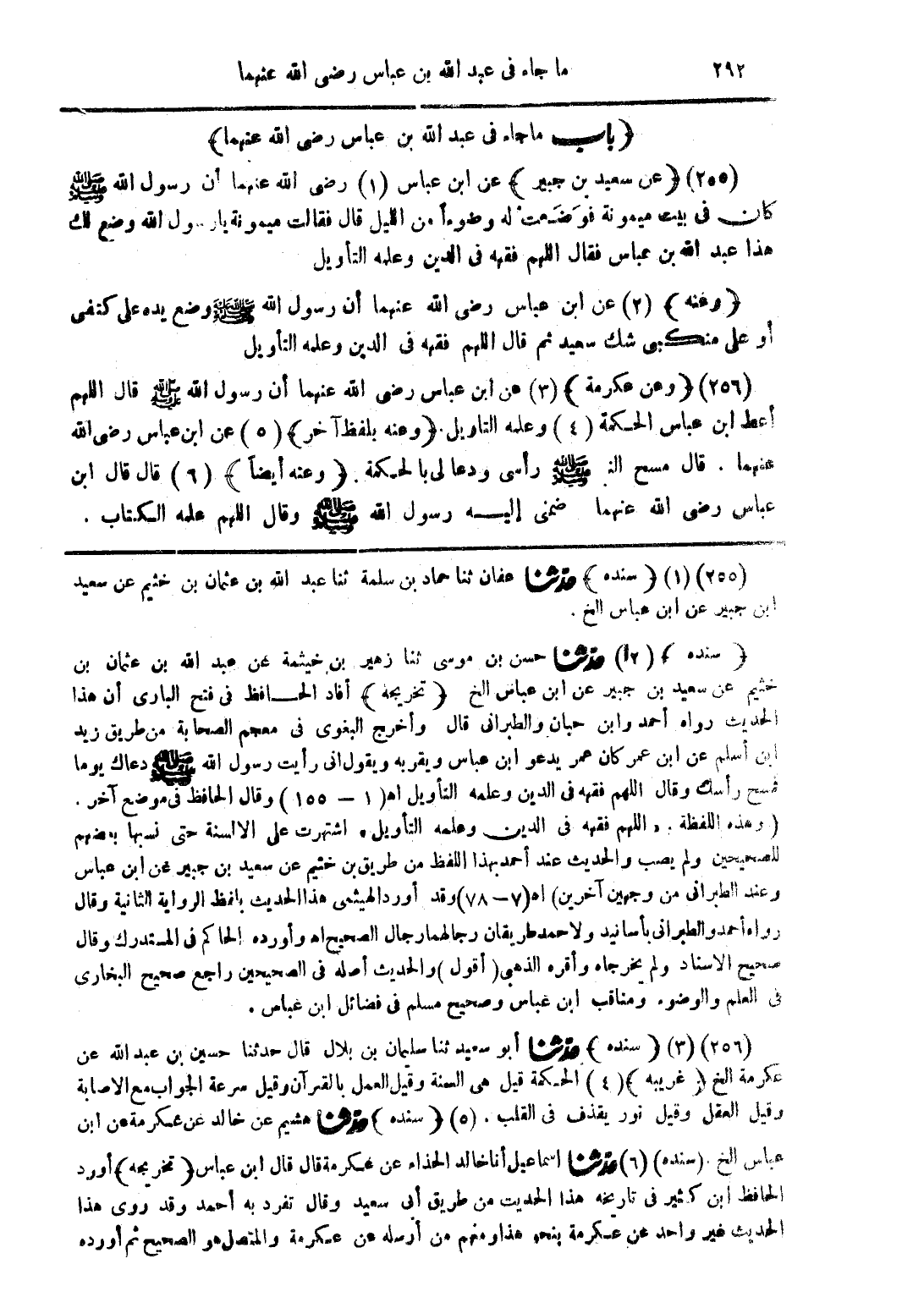 (256) (وعن عكرمة) عن ابن عباس رضى الله عنهما أن رسول الله صلى الله عليه وسلم قال اللهم أعط ابن عباس الحكمة وعلمه التاويل (وعنه بلفظ آخر) عن ابن عباس رضى الله عنهما. قال مسح النبى صلى الله عليه وسلم رأسى ودعا لى بالحكمة. (وعنه أيضًا) قال قال ابن عباس رضى الله عنهما ضمنى إليه رسول الله صلى الله عليه وسلم وقال اللهم علمه الكتاب.