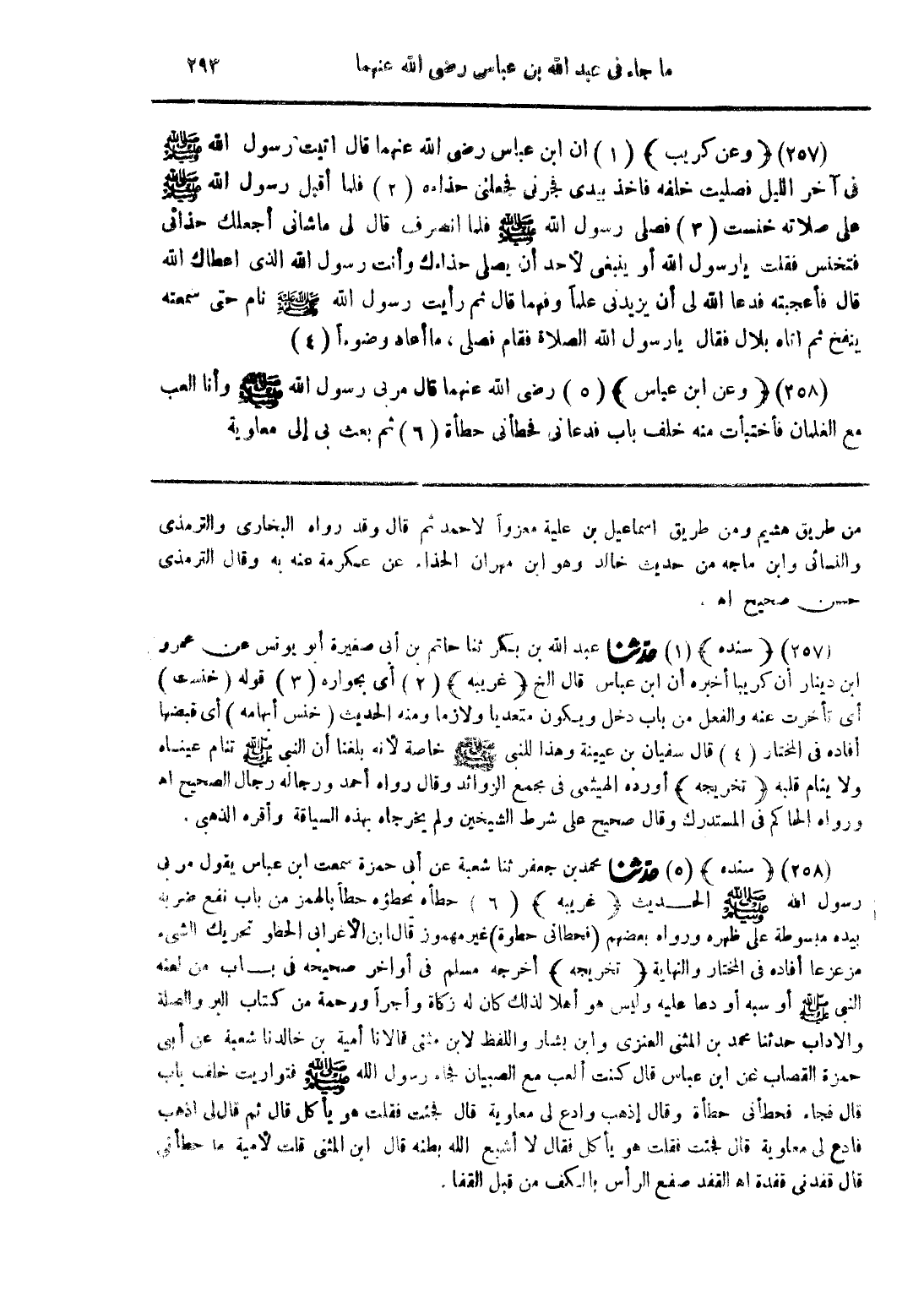(258) (وعن ابن عباس) رضى الله عنهما قال مر بى رسول الله صلى الله عليه وسلم وأنا العب مع الغلمان فأختبأت منه خلف باب فدعانى فحطأنى حطأة ثم بعث بى إلى معاوية