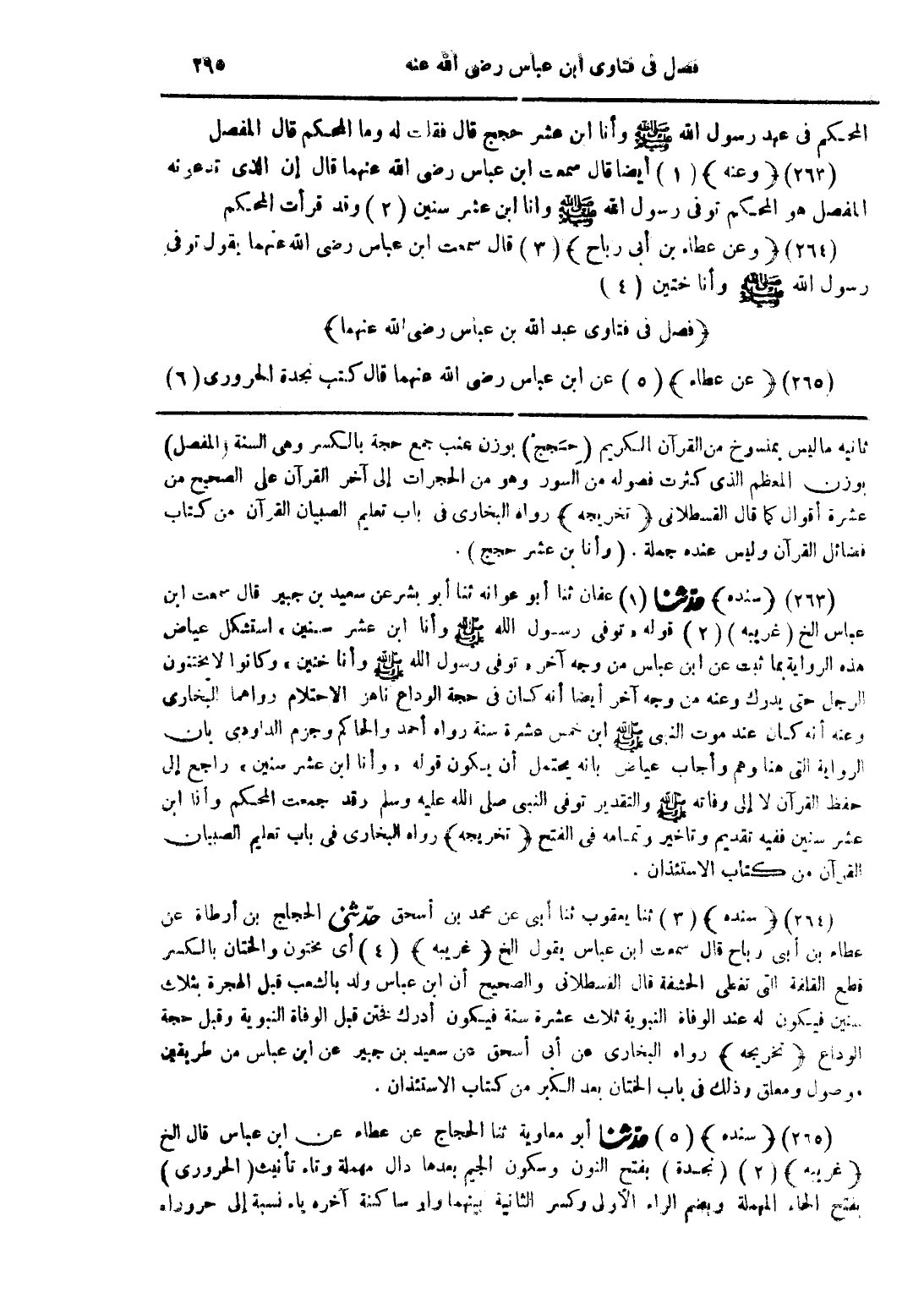 (263) (وعنه) أيضا قال سمعت ابن عباس رضى الله عنهما قال إن الذى تدعونه المفصل هو المحكم توفى رسول الله صلى الله عليه وسلم وانا ابن عشر سنين وقد قرأت المحكم