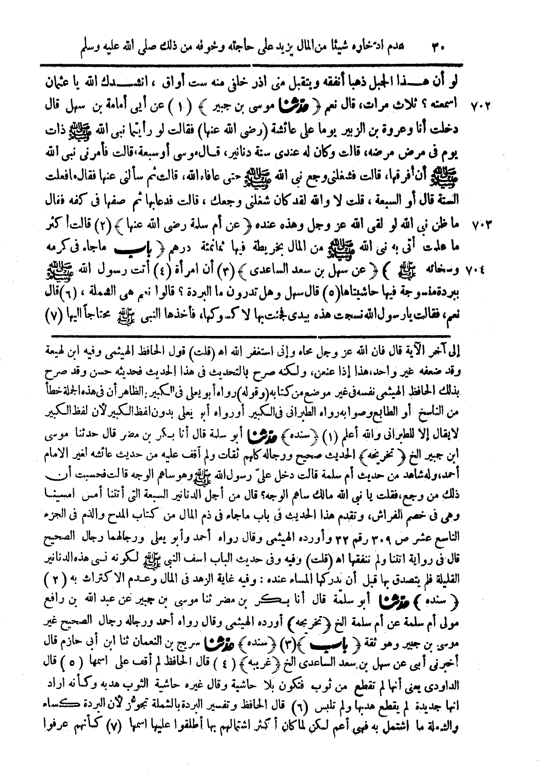 إلى آخر الآية قال فان الله عز وجل محاه وإني استغفر الله اهـ (قلت) قول الحافظ الهيثمي وفيه ابن لهيعة وقد ضعفه غير واحد، هذا إذا عنعن، ولكنه صرح بالتحديث في هذا الحديث فحديثه حسن وقد صرح بذلك الحافظ الهيثمي نفسه في غير موضع من كتابه (وقوله) رواه أبو يعلى في الكبير: الظاهر أن في هذه الجملة خطأ من الناسخ أو الطابع وصوابه رواه الطبراني في الكبير أو رواه أبو يعلي بدون لفظ الكبير لأن لفظ الكبير لا يقال إلا للطبراني والله أعلم (1) (سنده) حدثنا أبو سلمة قال أنا بكر بن مضر قال حدثنا موسى ابن جبير الخ (تخريجه) الحديث صحيح ورجاله كلهم ثقات ولم أقف عليه من حديث عائشة لغير الإمام أحمد، وله شاهد من حديث أم سلمة قالت دخل علىّ رسول الله صلى الله عليه وسلم وهو ساهم الوجه قالت فحسبت أن ذلك من وجع، فقلت يا نبي الله مالك ساهم الوجه؟ قال من أجل الدنانير السبعة التى أتتنا أمس امسينا وهي في خصم الفراش، وتقدم هذا الحديث في باب ما جاء في ذم المال من كتاب المدح والذم في الجزء التاسع عشر ص 309 رقم 32 وأورده الهيثمى وقال رواه أحمد وأبو يعلى ورجالهما رجال الصحيح قال في رواية اتتنا ولم ننفقها اهـ (قلت) وفيه وفي حديث الباب آسف النبي صلى الله عليه وسلم لكونه نى هذه الدنانير القليلة فلم يتصدق بها قبل أن يدركها المساء عند: وفيه غاية الزهد في المال وعدم الاكتراث به (2) (سنده) حدثنا أبو سلمة قال أنا بكر بن مضر ثنا موسى بن جبير عن عبد الله بن رافع مولى أم سلمة عن أم سلمة الخ (تخريجه) أورده الهيثمي وقال رواه أحمد ورجاله رجال الصحيح غير موسى بن جبير وهو ثقة (باب) (3) (سنده) حدثنا سريج بن النعمان ثنا ابن أبي حازم قال أخبرني أبي عن سهل بن سعد الساعدي الخ (غريبه) (4) قال الحافظ لم أقف على اسمها (5) قال الدوادي يعني أنها لم تقطع من ثوب فتكون بلا حاشية وقال غيره حاشية الثوب هدبه وكأنه اراد أنها جديدة لم يقطع هدبها ولم تلبس (6) قال الحافظ وتفسير البردة بالشملة تجوز لأن البردة كساء والشملة ما اشتمل به فهي أعم لكن لما كان أكثر اشتمالهم بها أطلقوا عليها اسمها (7) كأنهم عرفوا
