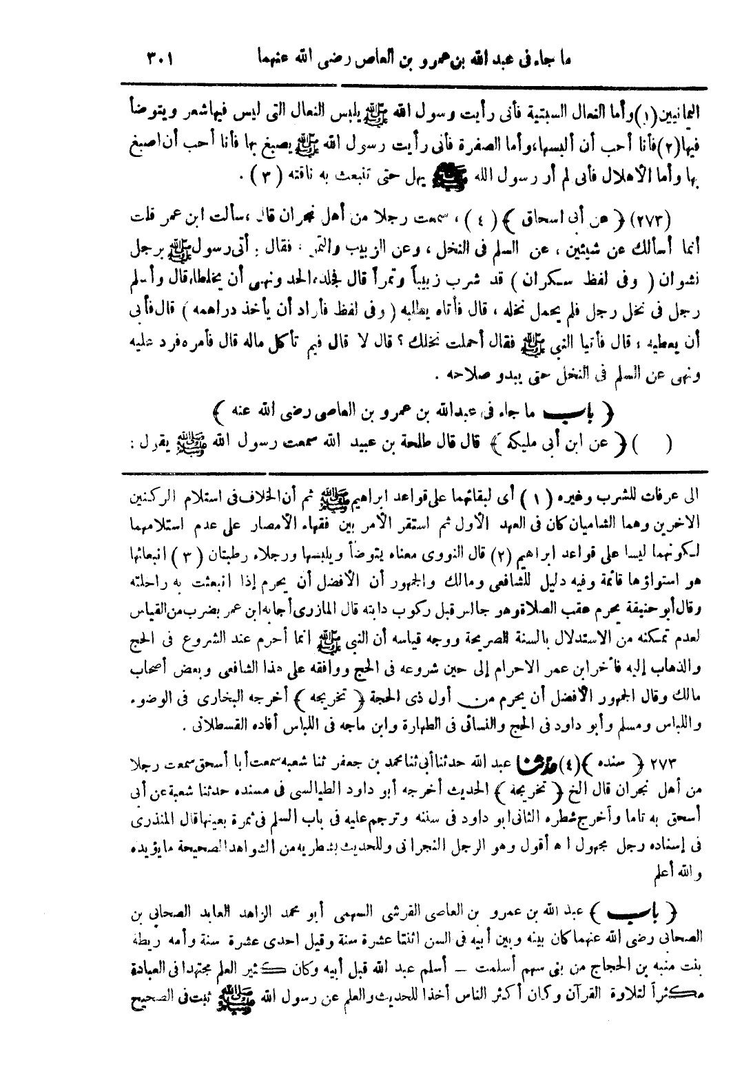(273) (عن أبي أسحاق) (4)، سمعت رجلًا من أهل جعفر أن قال، سألت أبن عمر قلت أنما أسألك عن شيئين، عن السلم في النخل، وعن الزبيب والتمر، فقال: أتي رسول الله صلى الله عليه وسلم برجل نشوان (وفي لفظ سكران) قد شرب زبيباً وتمراً قال فجلد، الحد ونهى أن يخلطا، قال وأسلم رجل في نخل رجل فلم يحمل نخله، قال فأتاه يطلبه (وفي لفظ فأراد أن يأخذ دراهمه) قال فأبى أن يعطيه، قال فأتيا النبي صلى الله عليه وسلم فقال أحملت نخلك؟ قال لا قال فيم تأكل ماله قال فأمره فرد عليه ونهى عن السلم في النخل حتى يبدو صلاحه.