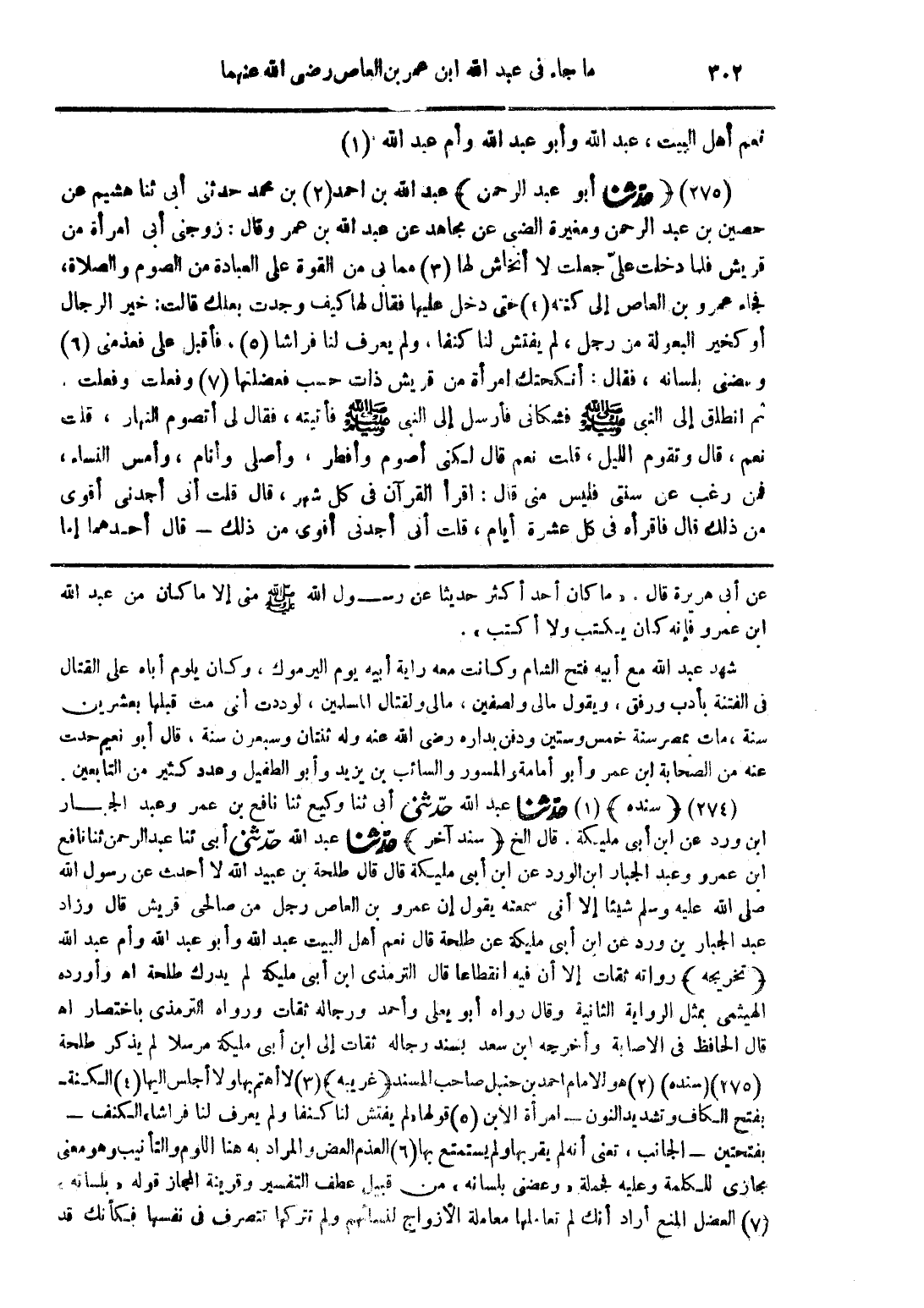 (274) (سنده) (1) حدّثنا عبد الله حدّثني أبي ثنا وكيع ثنا نافع بن عمر وعبد الجبار ابن ورد عن ابن أبي مليكة، قال الخ (سند آخر) حدّثنا عبد الله حدّثني أبي ثنا عبد الرحمن ثنا نافع ابن عمرو وعبد الجبار ابن الورد عن أبن أبي مليكة قال قال طلحة بن عبيد الله لا أحدث عن رسول الله صلى الله عليه وسلم شيئًا إلا أني سمعته يقول إن عمرو بن العاص رجل من صالحي قريش قال وزاد عبد الجبار بن ورد عن ابن أبي مليكة عن طلحة قال نعم أهل البيت عبد الله وأبو عبد الله وأم عبد الله (تخريجه) رواته ثقات إلا أن فيه انقطاعا قال الترمذي ابن أبي مليكة لم يدرك طلحة اهـ وأورده الهيثمي بمثل الرواية الثانية وقال رواه أبو يعلى واحمد ورجاله ثقات ورواه الترمذي باختصار اهـ قال الحافظ في الاصابة وأخرجه ابن سعد بسند رجاله ثقات إلى ابن أبي مليكة مرسلا لم يذكر طلحة (275) (سنده) (2) هو الامام أحمد بن حنبل صاحب المسند (غريبه) (3) لا أهتم بها ولا أجلس اليها (4) الكنة - بفتح الكاف وتشديد النون - امرأة الابن (5) قولها "لم يفتش لنا كنفا ولم يعرف لنا فراشا" الكنف - بفتحتين - الجانب، تعني أنه لم يقربها ولم يستمتع بها (6) العذم المض والمراد به هنا اللوم والتأنيب وهو معنى مجازي للكلمة وعليه فجملة "وعضني بلسان" من قبيل عطف التفسير وقرينة المجاز قوله "بلسان " (7) العضل المنع أراد أنك لم تعاملها معاملة الأزواج لنسائهم ولم تتركها تتصرف في نفسها فكأنك قد