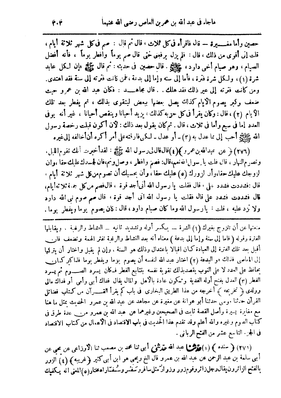 منعتها عن أن تتزوج بغيرك (1) الشرة - بكسر أوله وتشديد ثانيه - النشاط والرغبة، ويقابلها الفترة وقوله (فأما إلى سنة وإما إلى بدعة) معناه أنه بعد النشاط والرغبة تفتر الهمة وتضعف فان أقبل بعد تلك الفترة إلى العبادة كان اقبالا باعتدال وذلك هو سنة، وإن لم يقبل واختار أن يتركها إلى المعاصي فذلك هو البدعة (2) اختار عبد الله لنفسه أن يصوم يوما ويفطر يوما فلما كبر كان يحافظ على العدد لا على النوب يقصد بذلك تقوية نفسه بتتابع الفطر فكان يسرد الصوم ثم يسرد الفطر (3) العدل بفتح أوله الفدية وتكون عادة بالأهل والمال يقال فداك أبي وأمي أو فداك مالي وولدي (تخريجه) أخرجه من هذا الطريق البخاري في باب كم يقرأ القرآن من كتاب فضائل القرآن حدثنا موسى حدثنا أبو عوانة عن مغيرة عن مجاهد عن عبد الله بن عمرو الحديث بمثل ما هنا مع مغاير يسيرة وأصل القصة ثابت في الصحيحين وغيرهما عن عبد الله بن عمرو من عدة طرق في كتاب الصوم وغيره والله أعلم وقد تقدم هذا الحديث في باب الاقتصاد في الأعمال من كتاب الاقتصاد في الجزء التاسع عشر من الفتح الرباني.