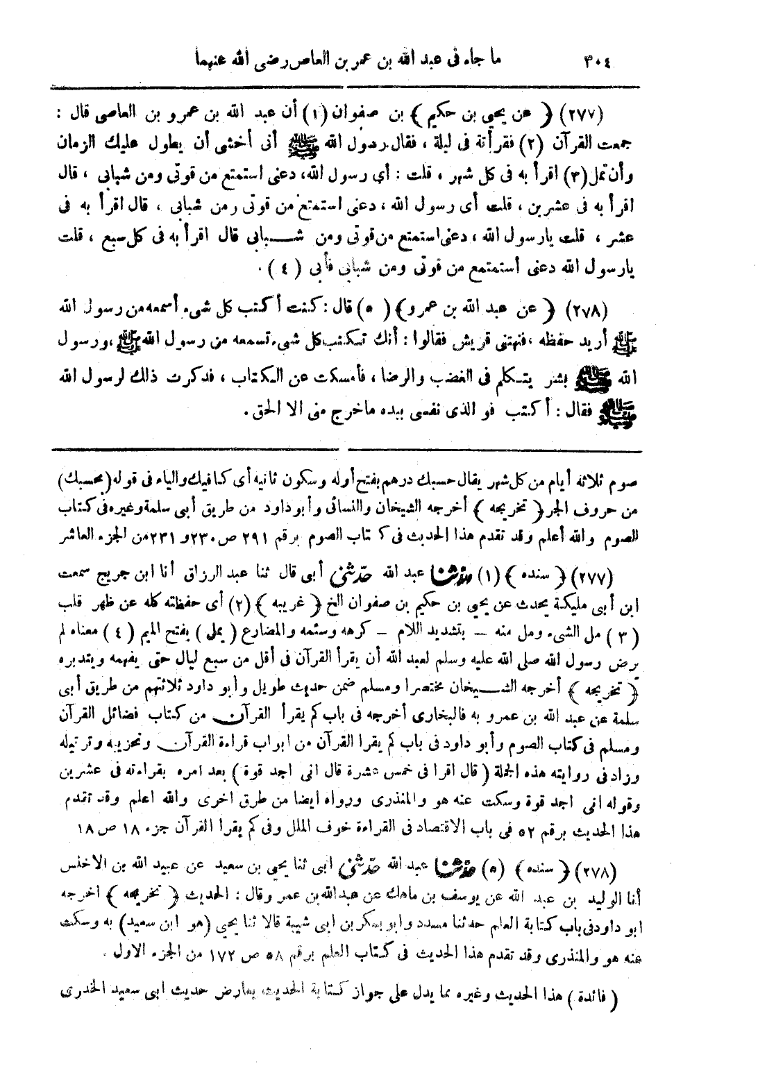 (277) (سنده) (1) حدّثنا عبد الله حدّثني أبي قال ثنا عبد الرزاق أنا ابن جريج سمعت ابن أبي مليكة يحدث عن يحي بن حكيم بن صفوان الخ (غريبه) (2) أي حفظته كله عن ظهر قلب (3) مل الشيء ومل منه - بتشديد اللام - كرهه وسئمه والمضارع (يملى) بفتح الميم (4) معناه لم يرض رسول الله صلى الله عليه وسلم لعبد الله أن يقرأ القرآن في أقل من سبع ليال حتى يفهمه ويتدبره (تخريجه) أخرجه الشيخان مختصرا ومسلم ضمن حديث طويل وأبو داود ثلاثتهم من طريق أبي سلمة عن عبد الله بن عمرو به فالبخاري أخرجه في باب كم يقرأ القرآن من كتاب فضائل القرآن ومسلم في كتاب الصوم وأبو داود في باب كم يقرأ القرآن من أبواب قراءة القرآن وتخريجه وترتيله وزاد في روايته هذه الجملة (قال أقرأ في خمس عشرة قال أني أجد قوة) بعد امره بقراءته في عشرين وقوله اني اجد قوة وسكت عنه هو والمنذري ورواه ايضا من طريق اخرى والله اعلم وقد تقدم هذا الحديث برقم 52 في باب الاقتصاد في القراءة خوف الملل وفي كم يقرا القرآن جزء 18 ص 18.