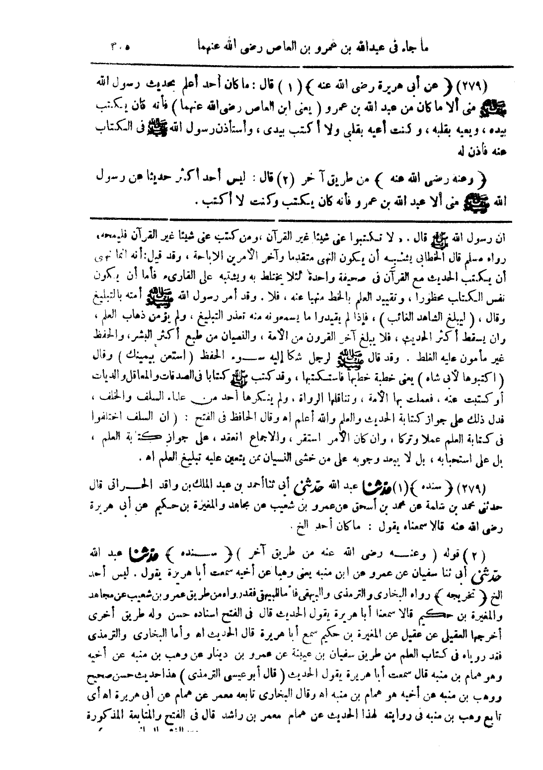 (279) (عن أبي هريرة رضي الله عنه) قال: ما كان أحد أعلم بحديث رسول الله صلى الله عليه وسلم مني ألا ما كان من عبد الله بن عمرو (يعني ابن العاص رضي الله عنهما) فإنه كان يكتب بيده، ويعيه بقلبه، وكنت أعيه بقلبي ولا أكتب بيدي، وأستأذن رسول الله صلى الله عليه وسلم في الكتاب عنه فأذن له.