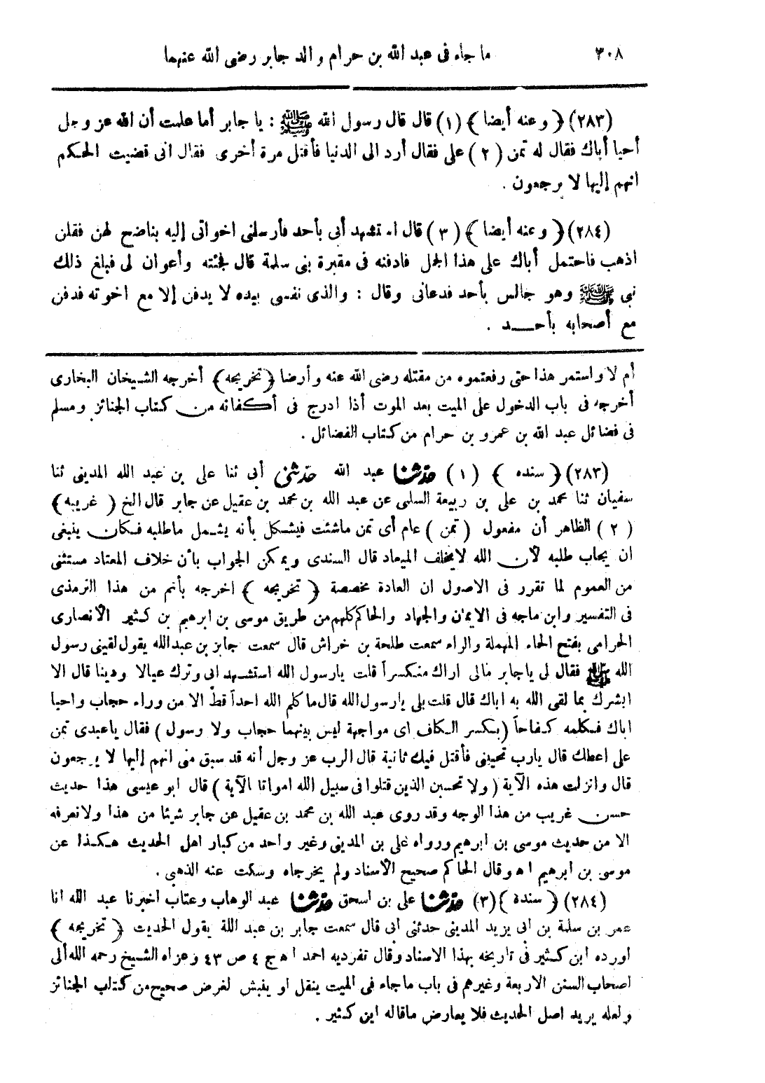 (284) (سنده) (3) حدّثنا علي بن إسحق حدّثنا عبد الوهاب وعتاب أخبرنا عبد الله أنا عمر بن سلمة بن أبي يزيد المديني حدثني أبي قال سمعت جابر بن عبد الله يقول الحديث (تخريجه) أورده ابن كثير في تاريخه بهذا الإسناد وقال تفرديه أحمد أهـ ج 4 ص 43 وعزاه الشيخ رحمه الله إلى أصحاب السنن الأربعة وغيرهم في باب ما جاء في الميت ينقل أو ينبش لغرض صحيح من كتاب الجنائز ولعله يريد أصل الحديث فلا يعارض ما قاله ابن كثير.