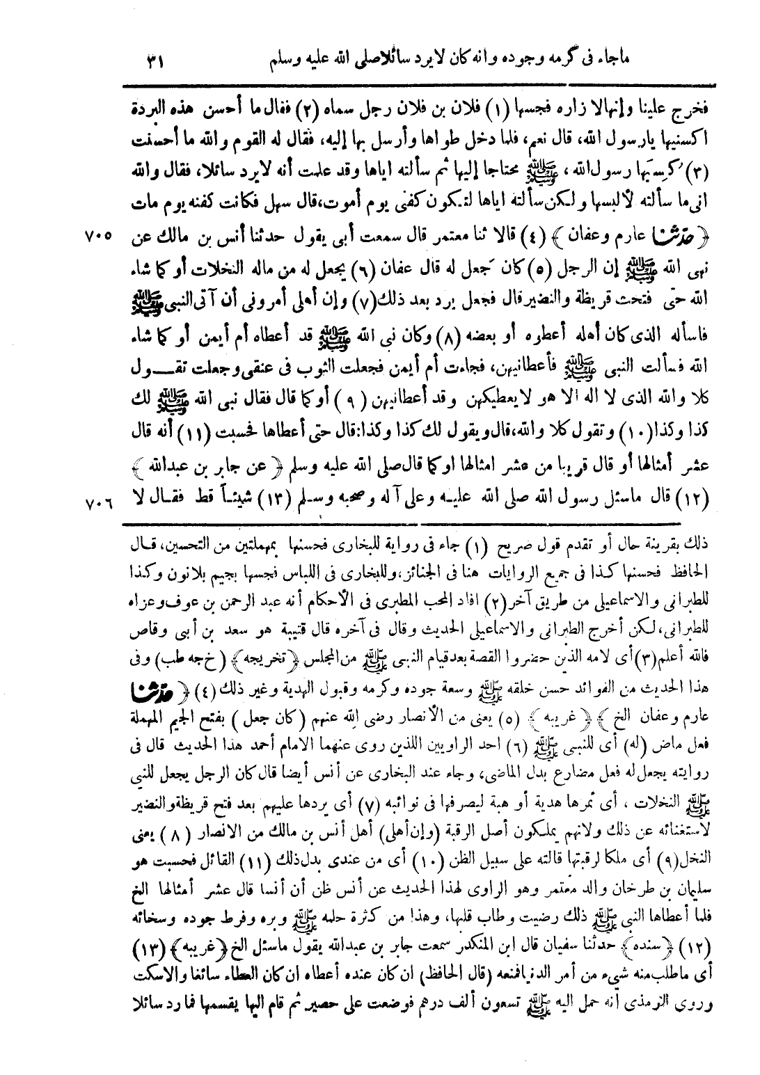 ذلك بقرينة حال أو تقدم قول صريح (1) جاء في رواية للبخاري فحسنها بمهملتين من التحسين، قال الحافظ فحسنها كذا في جميع الروايات هنا في الجنائز، وللبخاري في اللباس فحسها بجيم بلانون وكذا للطبراني والإسماعيلي من طريق آخر (2) افاد المحب المطبري في الأحكام أنه عبد الرحمن بن عوف وعزاه للطبراني، لكن أخرج الطبراني والإسماعيلي الحديث وقال في آخره قال قتيبة هو سعد بن أبي وقاص فالله أعلم (3) أي لامه الذين حضروا القصة بعد قيام النبي صلى الله عليه وسلم من المجلس (تخريجه) (خ جه طب) وفي هذا الحديث من الفوائد حسن خلقه صلى الله عليه وسلم وسعة جوده وكرمه وقبول الهدية وغير ذلك (4) (حدثنا عارم وعفان الخ) (غريبه) (5) يعني من الأنصار رضي الله عنهم (كان جعل) بفتح الجيم المهملة فعل ماض (له) أي للنبي صلى الله عليه وسلم (6) أحد الراويين اللذين روى عنهما الإمام أحمد هذا الحديث قال في روايته يجعل له فعل مضارع بدل الماضي، وجاء عند البخاري عن أنس أيضا قال كان الرجل يجعل للنبي صلى الله عليه وسلم النخلات، أي ثمرها هدية أو هبة ليصرفها في نوائبه (7) أي يردها عليهم بعد فتح قريظة والنضير لاستغنائه عن ذلك ولأنهم يملكون أصل الرقبة (وإن أهلى) أهل أنس بن مالك من الأنصار (8) يعني النخل (9) أي ملكا لرقبتها قالته على سبيل الظن (10) أي من عندي بدل ذلك (11) القائل فحسبت هو سليمان بن طرخان والد معتمر وهو الراوي لهذا الحديث عن أنس ظن أن أنسا قال عشر أمثالها الخ فلما أعطاها النبي صلى الله عليه وسلم ذلك رضيت وطاب قلبها، وهذا من كثرة حلمه صلى الله عليه وسلم وبره وفرط جوده وسخائه (12) (سنده) حدثنا سفيان قال ابن المنكدر سمعت جابر بن عبد الله يقول ما سئل الخ (غريبه) (13) أي ما طلب منه شيء من أمر الدنيا فمنعه (قال الحافظ) أن كان عنده أعطاه أن كان العطاء سائفا والاسكت وروى الترمذي أنه حمل إليه صلى الله عليه وسلم تسعون ألف درهم فوضعت على حصير ثم قام إليها يقسمها فما رد سائلا