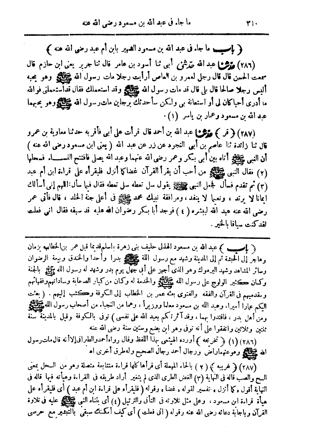 (287) (قر) حدّثنا عبد الله بن أحمد قال قرأت على أبي فأقر به حدثنا معاوية بن عمرو قال ثنا زائدة ثنا عاصم بن أبي النجود عن زر عن عبد الله (يعني ابن مسعود رضي الله عنه) أن النبي صلى الله عليه وسلم أتاه بين أبي بكر وعمر رضي الله عنهما وعبد الله يصلي فافتتح النساء فسحلها (2) فقال النبي صلى الله عليه وسلم من أحب أن يقرأ القرآن غضًا كما أنزل فليقرأه على قراءة ابن عبد الله (3) ثم تقدم فسأل فجعل النبي صلى الله عليه وسلم يقول سل تعطه فقال فيما سأل: اللهم إني أسألك إيمانًا لا يرتد، ونعيمًا لا ينفد، ومرافقة نبيك محمد صلى الله عليه وسلم في أعلى جنة الخلد، فقال فأتى عمر رضي الله عنه عبد الله ليبشره (4) فوجد أبا بكر رضوان الله عليه قد سبقه فقال إني فعلت لقد كنت سباقًا بالخير.