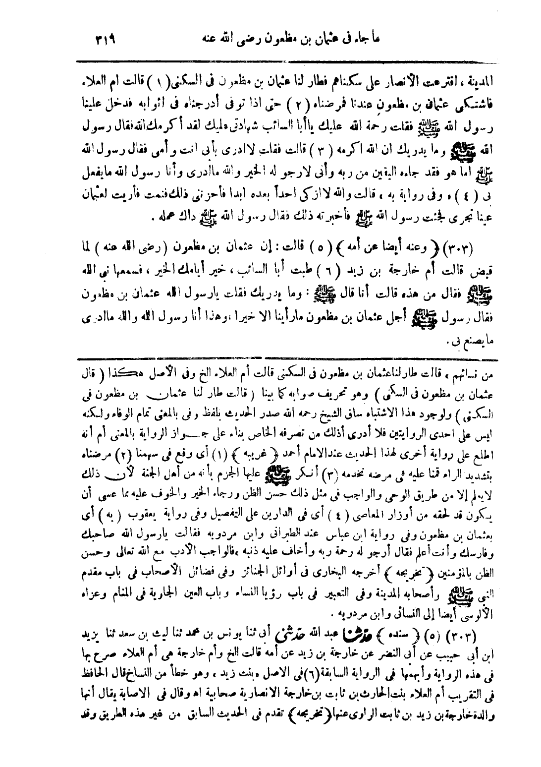(303) (وعنه أيضًا عن أمه) قالت: إن عثمان بن مظعون (رضي الله عنه) لما قبض قالت أم خارجة بن زيد طبت أبا السائب، خير أيامك الخير، فسمعها نبي الله صلى الله عليه وسلم فقال من هذه قالت أنا قال صلى الله عليه وسلم: وما يدرك فقلت يا رسول الله عثمان بن مظعون فقال رسول صلى الله عليه وسلم أجل عثمان بن مظعون ما رأينا إلا خيرًا، وهذا أنا رسول الله والله ما أدري ما يصنع بي.