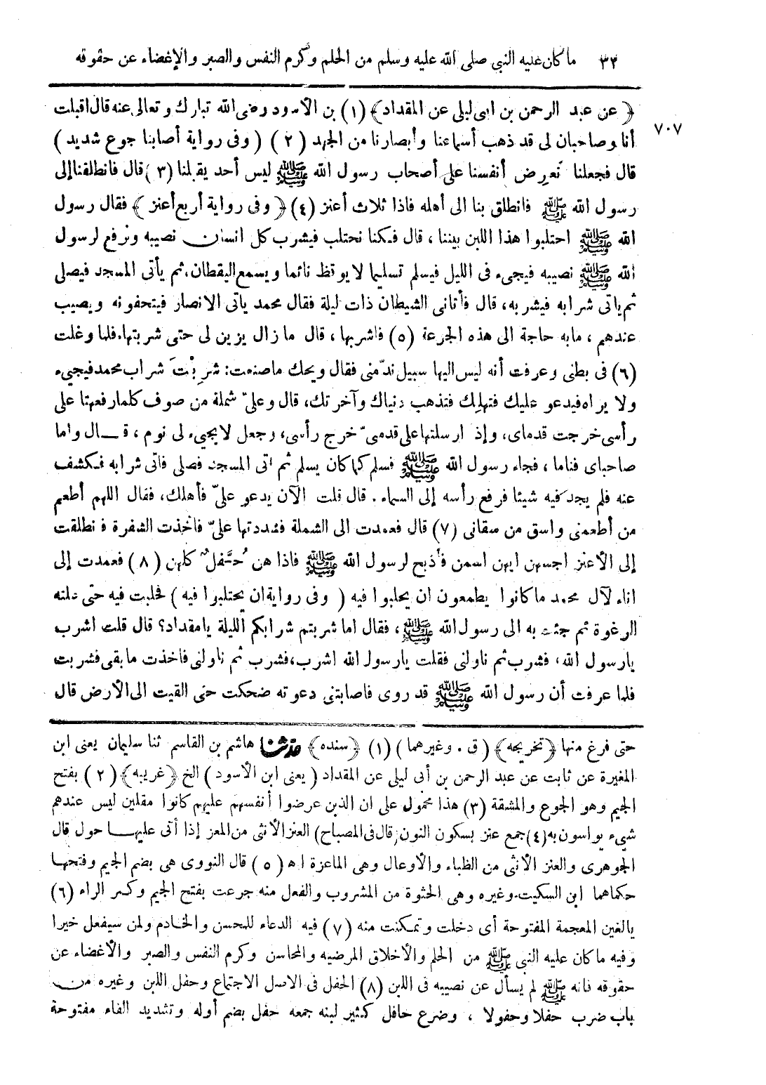 حتى فرغ منها (تخريجه) (ق. وغيرهما) (1) (سنده) حدثنا هاشم بن القاسم ثنا سليمان يعني ابن المغيرة عن ثابت عن عبد الرحمن بن أبي ليلى عن المقداد (يعني ابن الأسود) الخ (غريبه) (2) بفتح الجيم وهو الجوع والمشقة (3) هذا محمول على أن الذين عرضوا أنفسهم عليهم كانوا مقلين ليس عندهم شيء يواسون به (4) جمع عنز بسكون النون قال في المصباح) العنز الأنثى من المعز إذا أتى عليها حول قال الجوهري والعنز الأنثى من الظباء والأوعال وهي الماعزة اهـ (5) قال النووي هي بضم الجيم وفتحها حكماهما ابن السكيت. وغيره وهي الحثوة من المشروب والفعل منه جرعت بفتح الجيم وكسر الراء (6) يالغين المعجمة المفتوحة أي دخلت وتمكنت منه (7) فيه الدعاء للمحسن والخادم ولمن سيفعل خيرا وفيه ما كان عليه النبي صلى الله عليه وسلم من الحلم والأخلاق المرضيه والمحاسن وكرم النفس والصبر والأعضاء عن حقوقه فانه صلى الله عليه وسلم لم يسأل عن نصيبه في اللبن (8) الحفل في الأصل الاجتماع وحفل اللبن وغيره من باب ضرب حفلا وحفولا، وضرع حافل كثير لبنه جمعه حفل بضم أوله وتشديد الفاء مفتوحة