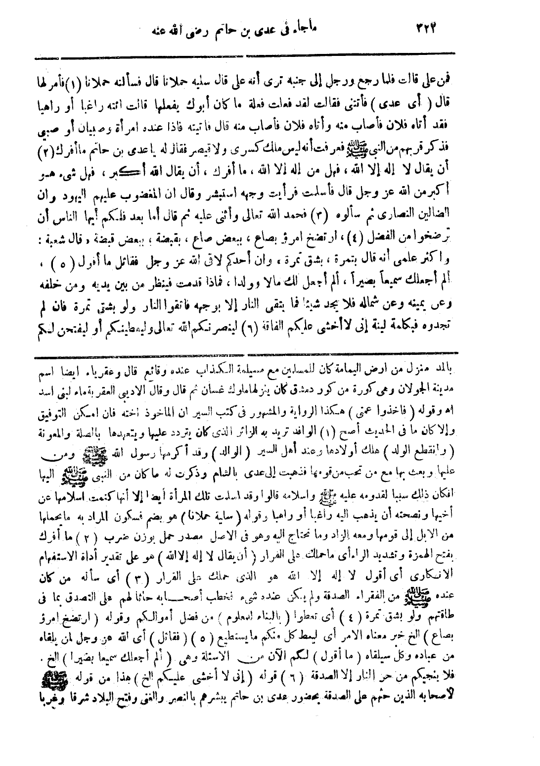 بالمد منزل من ارض اليمامة كان للمسلمين مع مسيلمة الكذاب عنده وقائع قال وعقرباء أيضا اسم مدينة الجولان وهى كورة من كور دمشق كان ينزلها ملوك غسان ثم قال وقال الادبي العقربة ماء لبنى اسد اهـ وقوله (فاخذوا عمتى) هكذا الرواية والمشهور فى كتب السير ان المأخوذ اخته فان امكن التوفيق وإلا كان ما فى الحديث أصح (1) الوافد تريد به الزائر الذى كان يتردد عليها ويتعهدها بالصلة والمعونة (وانقطع الولد) هلك أولادها وعند أهل السير (الوالد) وقد أكرمها رسول الله صلى الله عليه وسلم ومن عليها وبعث بها مع من تحب من قومها فذهبت إلى عدى بالشام وذكرت له ما كان من النبى صلى الله عليه وسلم اليها افكان ذلك سببا لقدومه عليه صلى الله عليه وسلم واسلامه قالوا وقد اسلمت تلك المرأة أيضا إلا أنها كتمت اسلامها عن أخيها ونصحته أن يذهب اليه راغبا أو راهبا وقوله (سلية حملانا) هو بضم فسكون المراد به ما يحملها من الابل إلى قومها ومعه الزاد وما تحتاج اليه وهو فى الاصل مصدر حمل بوزن ضرب (2) ما أفرك بفتح الهمزة وتشديد الراء أى ما حملك على الفرار (أن يقال لا إله إلا الله) هو على تقدير أداة الاستفهام الانكارى أى أقول لا إله إلا الله هو الذى حملك على الفرار (3) أى سأله من كان عنده صلى الله عليه وسلم من الفقراء الصدقة ولم يكن عنده شئ فخطب أصحابه حاثا لهم على التصدق بما فى طاقتهم ولو بشق تمرة (4) أى تعطوا (بالبناء للمعلوم) من فضل أموالكم وقوله (ارتضخ امرؤ بصاع) الخ خبر معناه الامر أى ليمط كل منكم ما يستطيع (5) (فقائل) أى الله عز وجل لمن يلقاه من عباده وكل سيلقاه (ما أقول) لكم الآن من الاسئلة وهى (ألم أجعلك سميعا بصيرا) الخ. فلا ينجيكم من حر النار إلا الصدقة (6) قوله (إنى لا أخشى عليكم الخ) هذا من قوله صلى الله عليه وسلم لأصحابه الذين حثهم على الصدقة بحضور عدى بن حاتم يبشرهم بالنصر والغنى وفتح البلاد شرقا وغربا