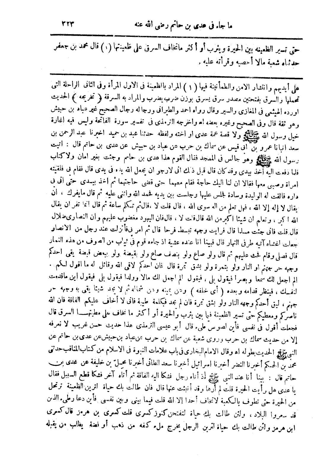 على أيديهم وانتشار الامن والطمأنينة فيها (1) المراد بالظعينة فى الاول المرأة وفى الثانى الراحلة التى تحملها والسرق بفتحتين مصدر سرق يسرق بوزن ضرب يضرب والمراد به السرقة (تخريجه) الحديث اورده الهيثمى فى المغازى والسير وقال رواه احمد والطبرانى ورجاله رجال الصحيح غير عباد بن حبيش وهو ثقة قال وفى الصحيح وغيره بعضه اهـ واخرجه الترمذى فى تفسير سورة الفاتحة وليس فيه اغارة خيل ورسول الله صلى الله عليه وسلم ولا قصة عمة عدى او اخته ولفظه حدثنا عبد بن حميد اخبرنا عبد الرحمن بن سعد انبانا عمرو بن ابى قيس عن سماك بن حرب عن عباد بن حبيش عن عدى بن حاتم قال: أتيت رسول الله صلى الله عليه وسلم وهو جالس فى المسجد فقال القوم هذا عدى بن حاتم وجئت بغير امان ولا كتاب فلما دفعت اليه أخذ بيدى وقد كان قال قبل ذلك انى لارجو ان يجعل الله يده فى يدى قال فقام بى فلقيته امرأة وصبى معها فقالا ان لنا اليك حاجة فقام معهما حتى قضا حاجتهما ثم اخذ بيدى حتى اتى بى داره فالقت له الوليدة وسادة فجلس عليها وجلست بين يديه فحمد الله واثنى عليه ثم قال ما يفرك، ان يقال لا إله إلا الله، فهل تعلم من اله سوى الله، قال قلت لا، قال ثم تكلم ساعة ثم قال انما تفر ان يقال الله اكبر، وتعلم ان شيئا اكبر من الله قال قلت لا، قال فان اليهود مغضوب عليهم وان النصارى ضلال قال قلت فانى جئت مسلما قال فرايت وجهه تبسط فرحا قال ثم امر بى فأنزلت عند رجل من الانصار جعلت اغشاه أتيه طرفى النهار قال فبينا انا عنده عشية اذ جاءه قوم فى ثياب من الصوف من هذه النمار قال فصلى وقام فحث عليهم ثم قال ولو صاع ولو بنصف صاع ولو بقبضة ولو ببعض قبضة يقى احدكم وجه حر جهنم او النار ولو بتمرة ولو بشق تمرة قال فان احدكم لاقى الله وقائل له ما اقول لكم. الم اجعل لك سمعا وبصرا فيقول بلى، فيقول الم اجعل لك مالا وولدا فيقول فيقول بلى فيقول اين ما قدمت لنفسك، فينظر قدامه وبعده (أى خلفه) وعن يمينه وعن شماله ثم لا يجد شيئا يقى به وجهه حر جهنم، ليق أحدكم وجهه النار ولو بشق تمرة فان لم يجد فبكلمة طيبة فانى لا أخاف عليكم الفاقة فان الله ناصركم ومعطيكم حتى تسير الظعينة فيما بين يثرب والحيرة أو أكثر ما نخاف على مطيتها السرق قال فجعلت أقول فى نفسى فأين لصوص طئ قال أبو عيسى الترمذى هذا حديث حسن غريب لا نعرفه إلا من حديث سماك بن حرب وروى شعبة عن سماك بن حرب عن عباد بن حبيش عن عدى بن حاتم عن النبى صلى الله عليه وسلم الحديث بطوله اهـ وقال الامام البخارى فى باب علامات النبوة فى الاسلام من كتاب المناقب حدثنى محمد بن الحكم أخبرنا النضر أخبرنا اسرائيل أخبرنا سعد الطائى أخبرنا محل بن خليفة عن عدى بن حاتم قال: بينا أنا عند النبى صلى الله عليه وسلم إذ أتاه رجل فشكا اليه الفاقة ثم أتاه آخر فشكا قطع السبيل فقال يا عدى هل رأيت الحيرة قلت لم أرها وقد أنبئت عنها قال فان طالت بك حياة لترين الظعينة ترتحل من الحيرة حتى تطوف بالكعبة لا تخاف أحدا إلا الله قلت فيما بينى وبين نفسى فأين دعا رطئ الذين قد سعروا البلاد، ولئن طالت بك حياة لتفتحن كنوز كسرى قلت كسرى بن هرمز قال كسرى ابن هرمز ولئن طالت بك حياة لترين الرجل يخرج ملء كفه من ذهب أو فضة يطلب من يقبله